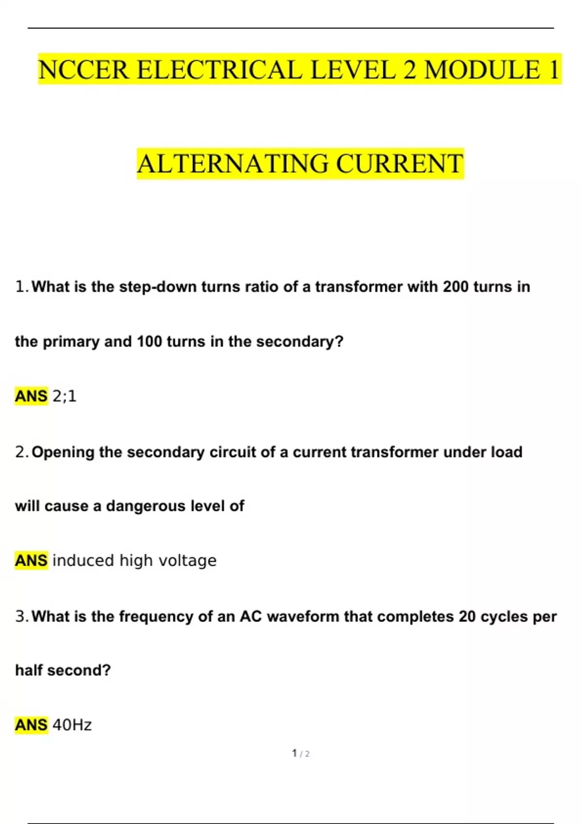 1. What is the step-down turns ratio of a transformer with 200 turns in