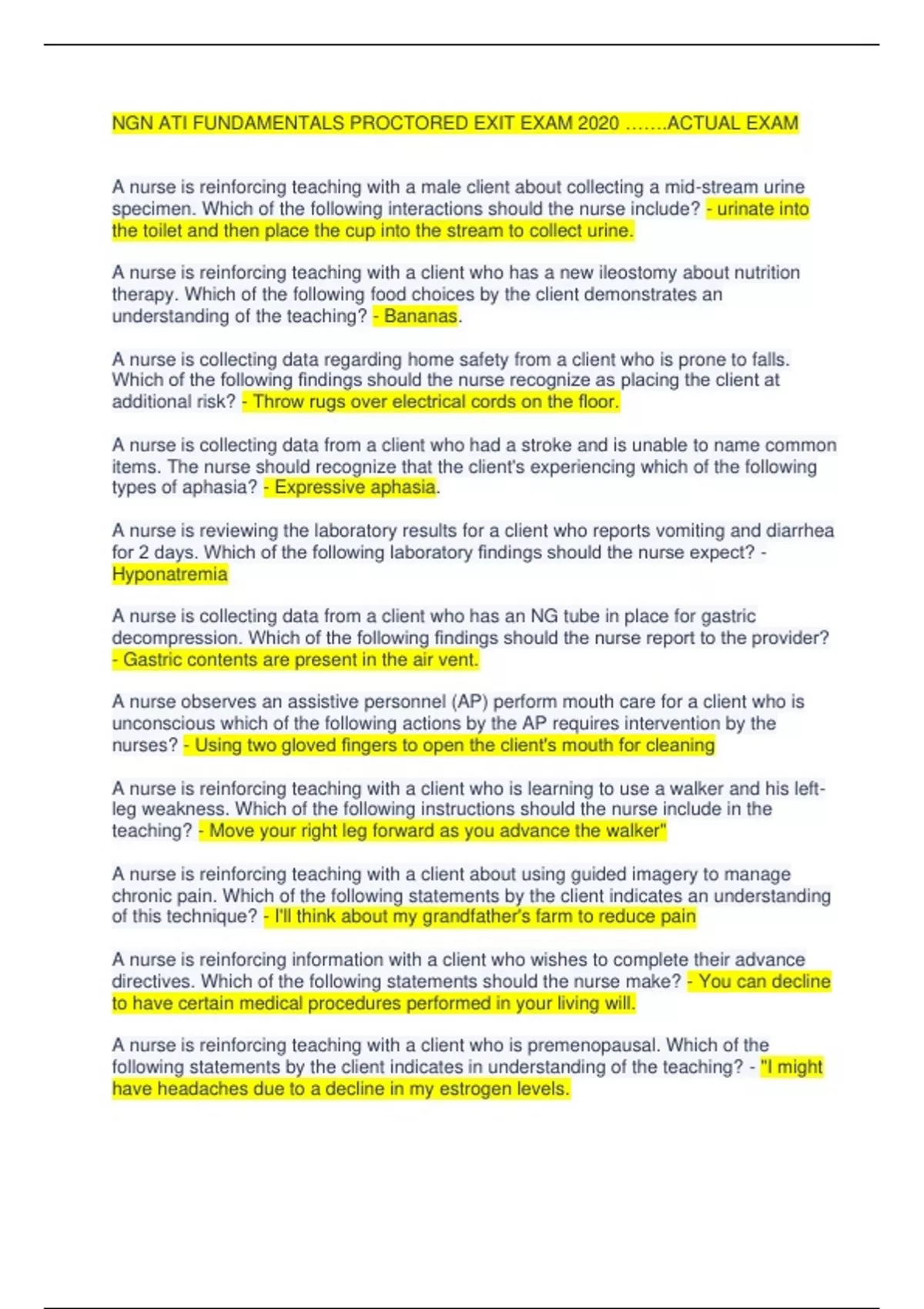 NGN ATI FUNDAMENTALS PROCTORED EXIT EXAM 2020 …….ACTUAL EXAM