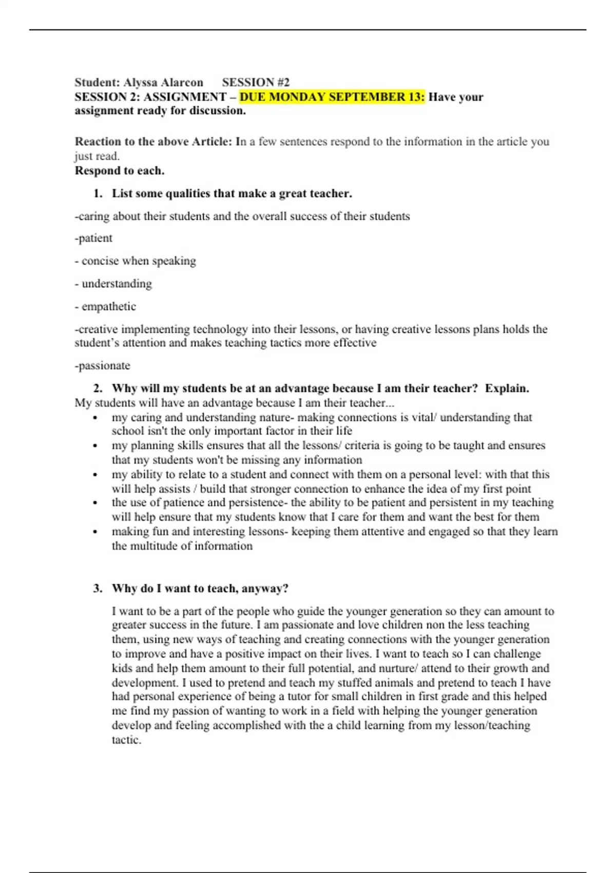 This document has answers to assignment two for orientation seminar course at Adelphi university for STEP education majors, in childhood ed.