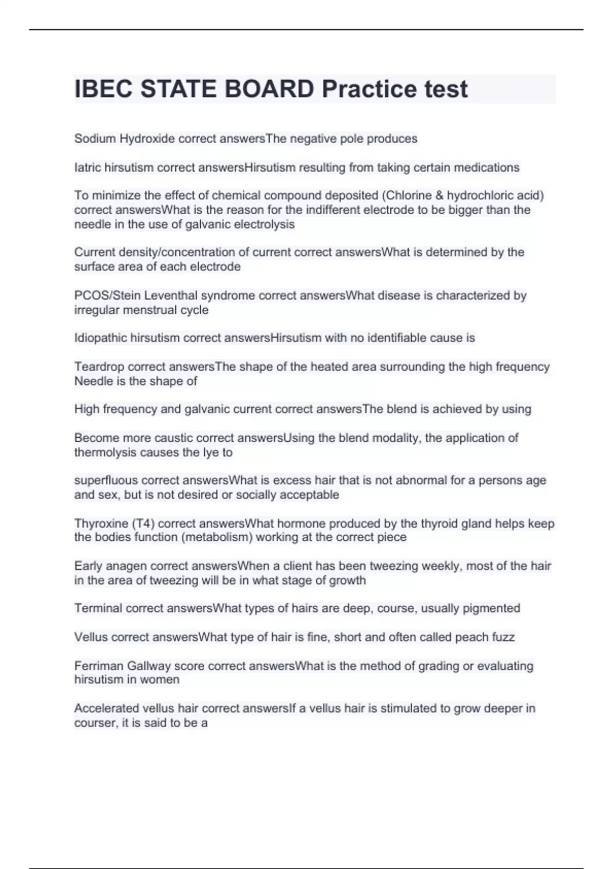 Sodium Hydroxide correct answersThe negative pole produces Iatric hirsutism correct answersHirsutism resulting from taking certain medications To minimize the effect of chemical compound deposited (Chlorine & hydrochloric acid) correct answersWhat is the reason for the indifferent electrode to be bigger than the needle in the use of galvanic electrolysis Current density/concentration of current correct answersWhat is determined by the surface area of each electrode PCOS/Stein Leventhal syndrome correct answersWhat disease is characterized by irregular menstrual cycle Idiopathic hirsutism correct answersHirsutism with no identifiable cause is Teardrop correct answersThe shape of the heated area surrounding the high frequency Needle is the shape of High frequency and galvanic current correct answersThe blend is achieved by using Become more caustic correct answersUsing the blend modality, the application of thermolysis causes the lye to superfluous correct answersWhat is excess hair that is not abnormal for a persons age and sex, but is not desired or socially acceptable Thyroxine (T4) correct answersWhat hormone produced by the thyroid gland helps keep the bodies function (metabolism) working at the correct piece Early anagen correct answersWhen a client has been tweezing weekly, most of the hair in the area of tweezing will be in what stage of growth Terminal correct answersWhat types of hairs are deep, course, usually pigmented Vellus correct answersWhat type of hair is fine, short and often called peach fuzz Ferriman Gallway score correct answersWhat is the method of grading or evaluating hirsutism in women Accelerated vellus hair correct answersIf a vellus hair is stimulated to grow deeper in courser, it is said to be a