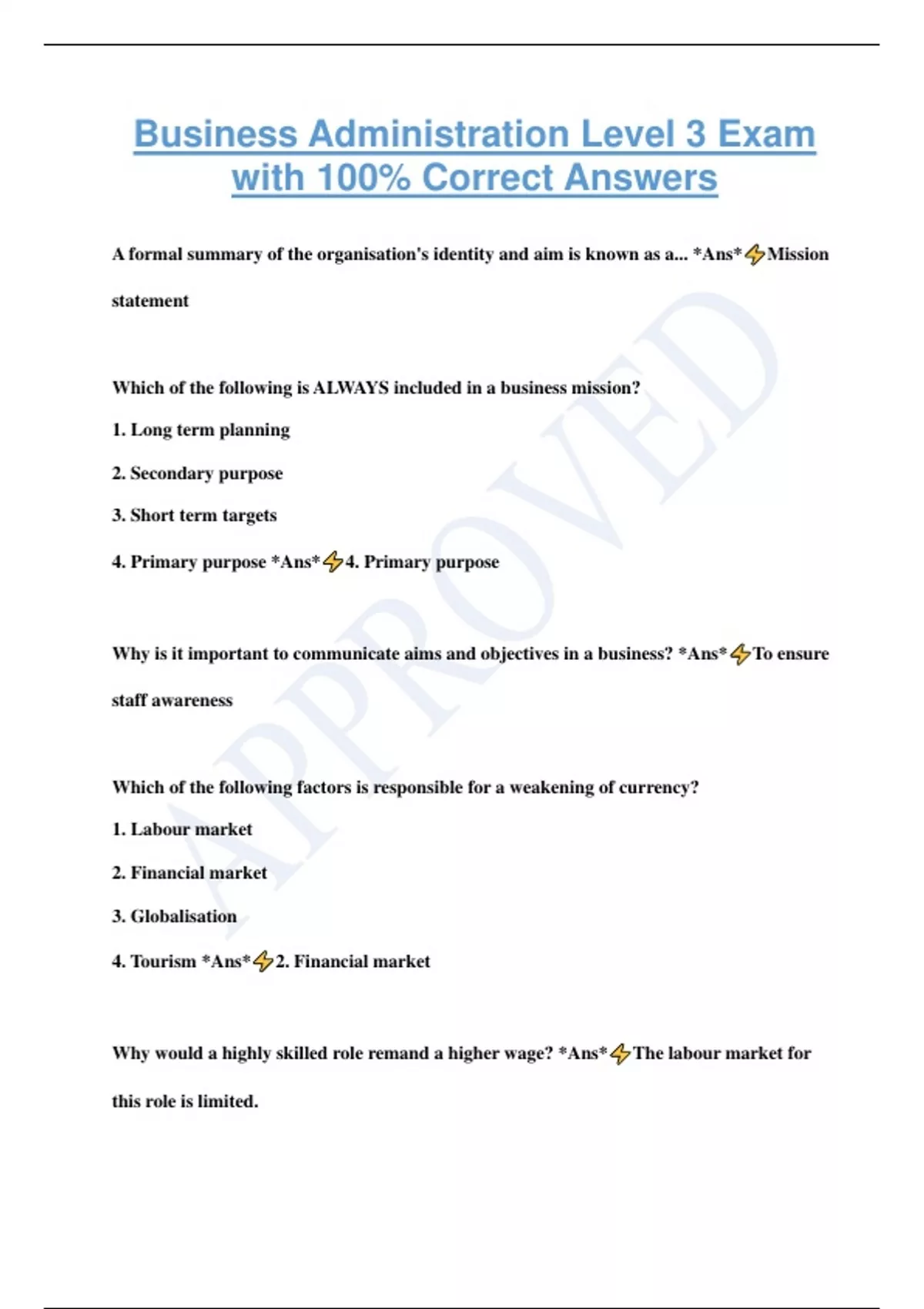 Business Administration Level 3 Exam with 100% Correct Answers A formal summary of the organisation's identity and aim is known as a... *Ans* Mission statement Which of the following is ALWAYS included in a business mission? 1. Long term planning 2. Secondary purpose 3. Short term targets 4. Primary purpose *Ans* 4. Primary purpose Why is it important to communicate aims and objectives in a business? *Ans* To ensure staff awareness Which of the following factors is responsible for a weakening of currency? 1. Labour market 2. Financial market 3. Globalisation 4. Tourism *Ans* 2. Financial market Why would a highly skilled role remand a higher wage? *Ans* The labour market for this role is limited. What is the potential impact of a delay in the supply chain? *Ans* You may have to offer compensation Identify the external factor that may affect an organisation; 1. Staff shortage 2. Raw material supply 3. Procedural change 4. Production line change *Ans* 2. Raw material supply What effect would an increase in export duties have on an organisation? *Ans* Fewer products would be ordered What does the "L" in PESTLE stand for? *Ans* Legal The organisation you work for has been researching the introduction of finger print scanning. What part of PESTLE does this relate to? *Ans* Technological If the aim of a project is to increase the new customer base by 6%, within budget before September, which of the following indicates a successful project?: 1. On budget by August with 7% customer base increase 2. Under budget before June with 4% customer base increase 3. On budget by September with 5% customer base increase 4. Overspend before June with 6% customer base increase *Ans* 1. On budget by August with 7% customer base increase Which of the following indicates a successful project has been completed? 1. all objectives have been met 2. all project aims and objectives have been met 3. most project aims and objectives have been met 4. some project aims and objectives have been met *Ans* 2. All project aims and objectives have been met In project management, resources such as computers, projectors, tables and whiteboards are examples of... *Ans* Equipment Project management requires a budget to be defined... 1. so it can be used 2. so that it is worked within 3. so it can be followed loosely 4. so that purchase orders are paid *Ans* 2. So that it is worked within A product breakdown structure is used in project management mainly for... 1. monitoring 2. reporting 3. planning