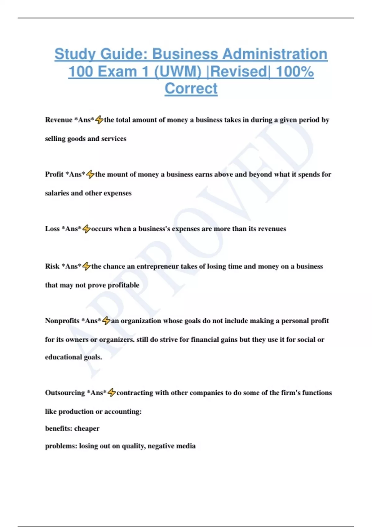 Study Guide: Business Administration 100 Exam 1 (UWM) |Revised| 100% Correct Revenue *Ans* the total amount of money a business takes in during a given period by selling goods and services Profit *Ans* the mount of money a business earns above and beyond what it spends for salaries and other expenses Loss *Ans* occurs when a business's expenses are more than its revenues Risk *Ans* the chance an entrepreneur takes of losing time and money on a business that may not prove profitable Nonprofits *Ans* an organization whose goals do not include making a personal profit for its owners or organizers. still do strive for financial gains but they use it for social or educational goals. Outsourcing *Ans* contracting with other companies to do some of the firm's functions like production or accounting: benefits: cheaper problems: losing out on quality, negative media Insourcing *Ans* foreign companies opening offices and factories in the US: benefits: you do everything & can make sure it's done right problems: more costs E-commerce *Ans* buying and selling of goods on the internet B2B *Ans* Business to Business: footlocker ordering shoes from Nike B2C *Ans* Business to Consumer: online shopping Database *Ans* an electronic storage file for informatio