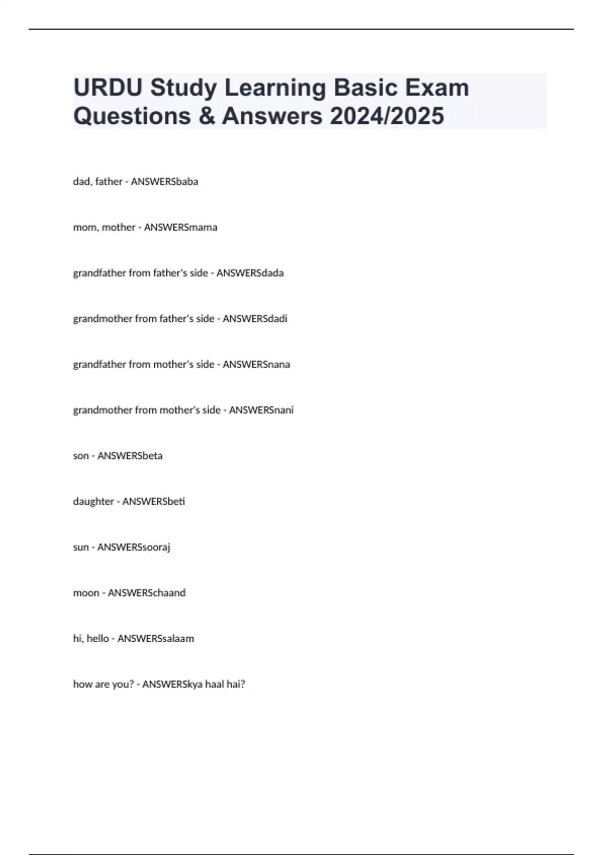 URDU Study Learning Basic Exam Questions & Answers 2024/2025 dad, father - ANSWERSbaba mom, mother - ANSWERSmama grandfather from father's side - ANSWERSdada grandmother from father's side - ANSWERSdadi grandfather from mother's side - ANSWERSnana grandmother from mother's side - ANSWERSnani son - ANSWERSbeta daughter - ANSWERSbeti sun - ANSWERSsooraj moon - ANSWERSchaand hi, hello - ANSWERSsalaam how are you? - ANSWERSkya haal hai?