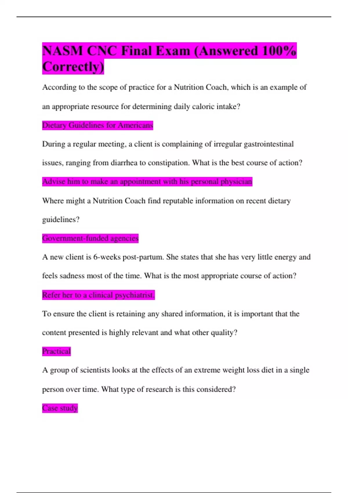 NASM CNC Final Exam (Answered 100% Correctly) According to the scope of practice for a Nutrition Coach, which is an example of an appropriate resource for determining daily caloric intake? Dietary Guidelines for Americans During a regular meeting, a client is complaining of irregular gastrointestinal issues, ranging from diarrhea to constipation. What is the best course of action? Advise him to make an appointment with his personal physician Where might a Nutrition Coach find reputable information on recent dietary guidelines? Government-funded agencies A new client is 6-weeks post-partum. She states that she has very little energy and feels sadness most of the time. What is the most appropriate course of action? Refer her to a clinical psychiatrist. To ensure the client is retaining any shared information, it is important that the content presented is highly relevant and what other quality? Practical A group of scientists looks at the effects of an extreme weight loss diet in a single person over time. What type of research is this considered? Case study Scientists perform a study comparing 1000 women with breast cancer to 1000 women without breast cancer. They gather information on the women's diets and look to see if the women diagnosed with breast cancer had more fat in their diet compared to the women who did not get cancer. Which term best describes this study? Case-control study Scientists find that a protein supplement increases lean mass in the elderly. However, they caution that the results may not apply to other populations, like younger people. What term best describes what the scientists are referring to?
