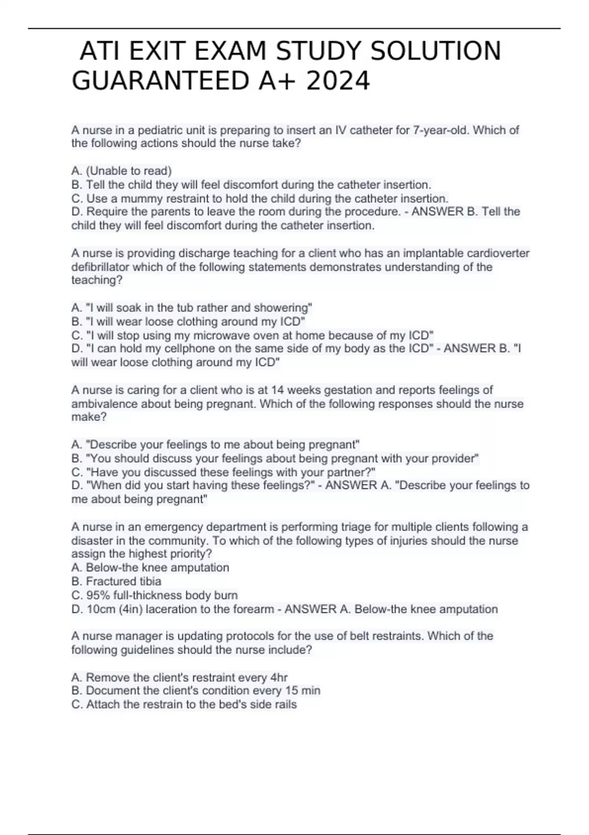A nurse in a pediatric unit is preparing to insert an IV catheter for 7-year-old. Which of the following actions should the nurse take? A. (Unable to read) B. Tell the child they will feel discomfort during the catheter insertion. C. Use a mummy restraint to hold the child during the catheter insertion. D. Require the parents to leave the room during the procedure. - ANSWER B. Tell the child they will feel discomfort during the catheter insertion. A nurse is providing discharge teaching for a client who has an implantable cardioverter defibrillator which of the following statements demonstrates understanding of the teaching? A. "I will soak in the tub rather and showering" B. "I will wear loose clothing around my ICD" C. "I will stop using my microwave oven at home because of my ICD" D. "I can hold my cellphone on the same side of my body as the ICD" - ANSWER B. "I will wear loose clothing around my ICD" A nurse is caring for a client who is at 14 weeks gestation and reports feelings of ambivalence about being pregnant. Which of the following responses should the nurse make? A. "Describe your feelings to me about being pregnant" B. "You should discuss your feelings about being pregnant with your provider" C. "Have you discussed these feelings with your partner?" D. "When did you start having these feelings?" - ANSWER A. "Describe your feelings to me about being pregnant" A nurse in an emergency department is performing triage for multiple clients following a disaster in the community. To which of the following types of injuries should the nurse assign the highest priority? A. Below-the knee amputation B. Fractured tibia C. 95% full-thickness body burn D. 10cm (4in) laceration to the forearm - ANSWER A. Below-the knee amputation A nurse manager is updating protocols for the use of belt restraints. Which of the following guidelines should the nurse include? A. Remove the client's restraint every 4hr B. Document the client's condition every 15 min C. Attach the restrain to the bed's side rails D. Request a PRN restrain prescription for clients who are aggressive - ANSWER B. Document the client's condition every 15 min A nurse in a provider's office is reviewing the laboratory results of a group of clients. The nurse should identify that which of the following sexually transmitted infections is a nationally notifiable infectious disease that should be reported to the state health department? A. Chlamydia B. Human papillomavirus C. Candidiasis D. Herps simplex virus - ANSWER A. Chlamydia A nurse is working on a surgical unit is developing a care plan for a client who has paraplegia. The client has an area of no blanchable erythema over his ischium. Which of the following interventions should the nurse include in the care plan? A. Place the client upright on a donut-shaped cushion B. Teach the client to shift his weight every 15 min while sitting C. Turn and reposition the client every 3 hr while in bed D. Assess pressure points every - ANSWER B. Teach the client to shift his weight every 15 min while sitting A charge nurse is teaching a newly licensed nurse about clients designating a health care proxy in situations that require a durable power of attorney for heal care (DPSHC). Which of the following information should the charge nurse include? A. "The proxy should make health care decisions for the client regardless of the client's ability to do so." B. "The proxy can make financial decisions if the need arises." C. "The proxy can make treatment decisions if the client is under anesthesia." D. "The proxy should manage legal issues for the client." - ANSWER C. "The proxy can make treatment decisions if the client is under anesthesia." A nurse is caring for a client who is dilated to 10 cm and pushing. Which of the following pain-management (Unable to read) a safe option for the client? A. Naloxone hydrochloride. B. Spinal anesthesia. C. Pudendal block. D. Butorphanol tartrate - ANSWER C. Pudendal block. A nurse is providing discharge teaching for a group of clients. The nurse should recommend a referral to a dietitian A. A client who has a prescription for warfarin and states "I will need to limit how much spinach I eat". B. A client who has gout and states, "I can continue to eat anchovies on my pizza." C. A client who has a prescription for spironolactone and states "I will reduce my intake of foods that contain potassium". D. A client who has (Unable to read) and states "I'll plan to take my calcium carbonate with a full glass of water" - ANSWER B. A client who has gout and states, "I can continue to eat anchovies on my pizza." A nurse is assessing a child who is being treated for bacterial pneumonia. The nurse notes an increase in the child's glucose. The nurse should identify this finding as an adverse effect of which of the following medications? A. Methylprednisolone. B. Ondansetron. C. Guaifenesin. D. Amoxicillin - ANSWER A. Methylprednisolone.