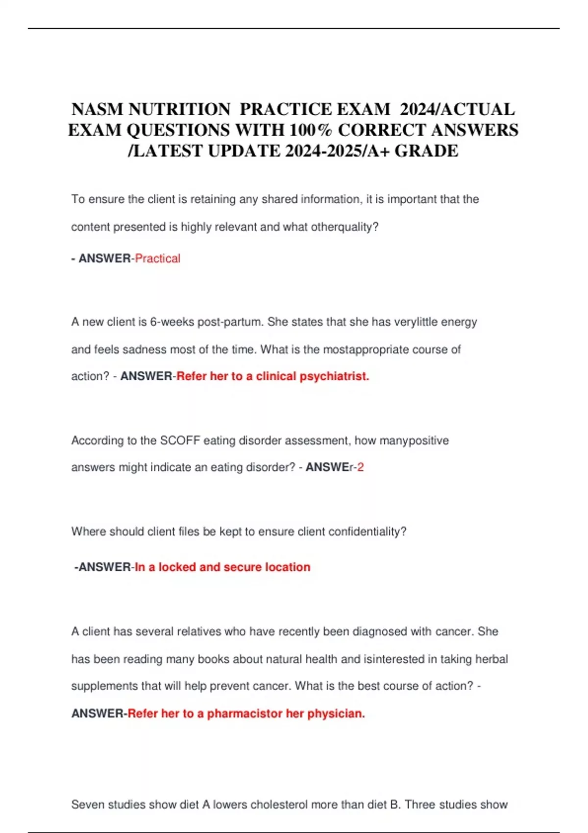 NASM NUTRITION PRACTICE EXAM 2024/ACTUAL EXAM QUESTIONS WITH 100% CORRECT ANSWERS /LATEST UPDATE /A+ GRADE