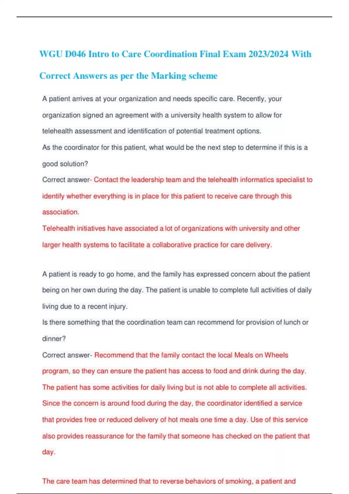 WGU D046 Intro to Care Coordination Final Exam 2023/2024 With Correct Answers as per the Marking scheme