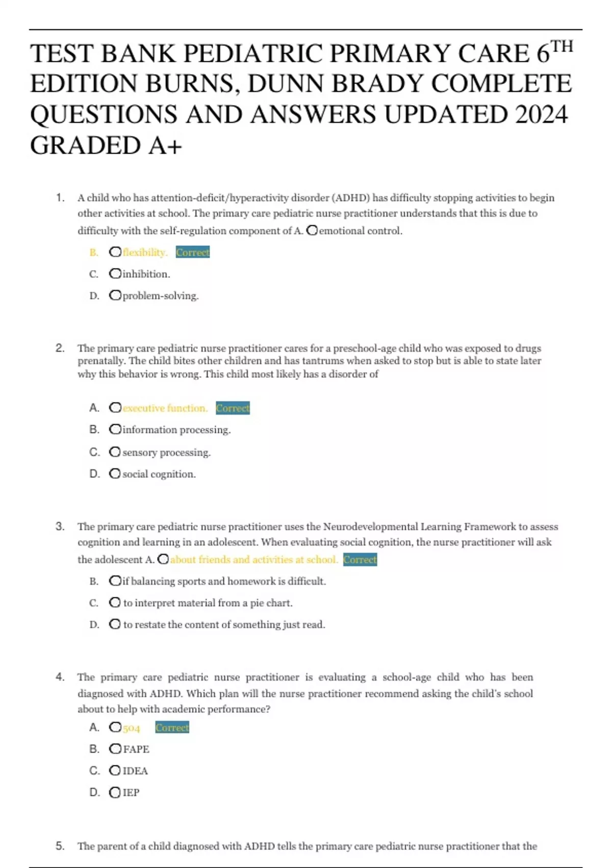 TEST BANK PEDIATRIC PRIMARY CARE 6TH EDITION BURNS, DUNN BRADY COMPLETE QUESTIONS AND ANSWERS UPDATED 2024 GRADED A+