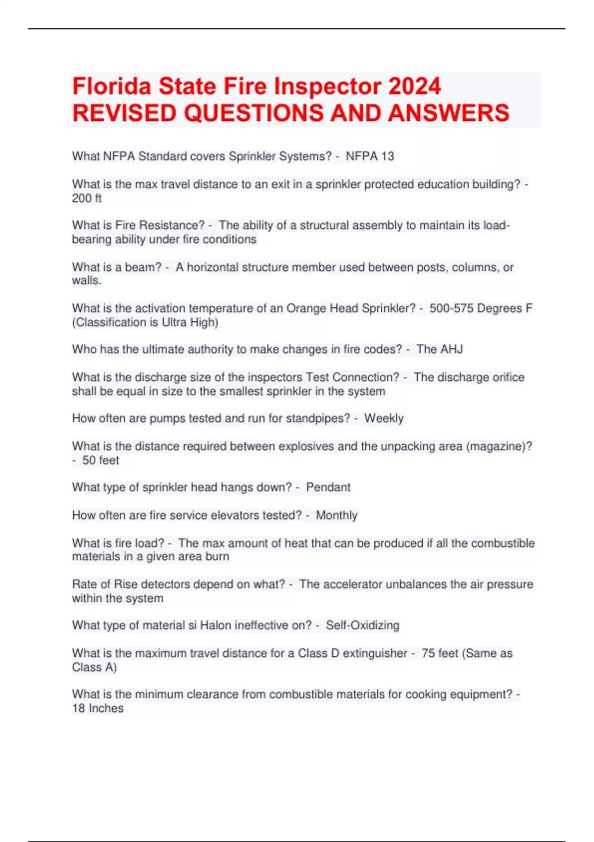 Florida State Fire Inspector 2024 REVISED QUESTIONS AND ANSWERS