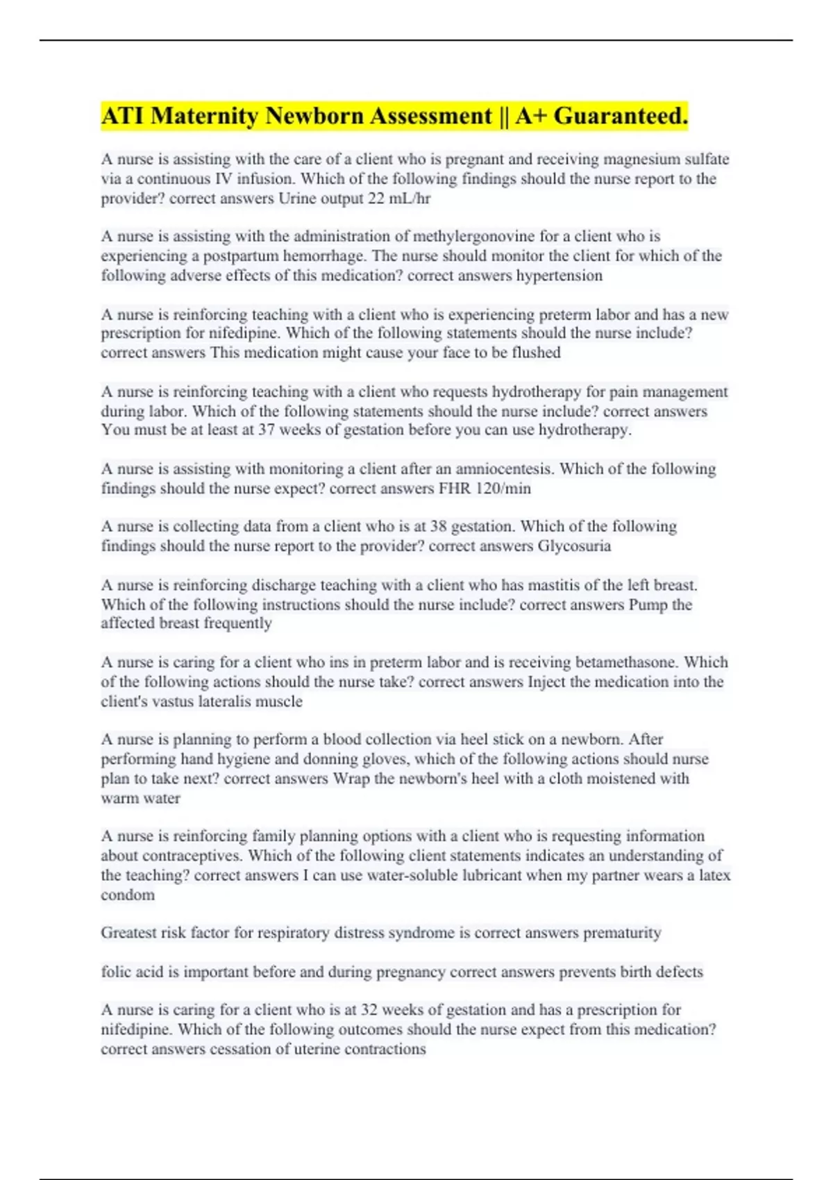 A nurse is assisting with the care of a client who is pregnant and receiving magnesium sulfate via a continuous IV infusion. Which of the following findings should the nurse report to the provider? correct answers Urine output 22 mL/hr A nurse is assisting with the administration of methylergonovine for a client who is experiencing a postpartum hemorrhage. The nurse should monitor the client for which of the following adverse effects of this medication? correct answers hypertension A nurse is reinforcing teaching with a client who is experiencing preterm labor and has a new prescription for nifedipine. Which of the following statements should the nurse include? correct answers This medication might cause your face to be flushed A nurse is reinforcing teaching with a client who requests hydrotherapy for pain management during labor. Which of the following statements should the nurse include? correct answers You must be at least at 37 weeks of gestation before you can use hydrotherapy. A nurse is assisting with monitoring a client after an amniocentesis. Which of the following findings should the nurse expect? correct answers FHR 120/min A nurse is collecting data from a client who is at 38 gestation. Which of the following findings should the nurse report to the provider? correct answers Glycosuria A nurse is reinforcing discharge teaching with a client who has mastitis of the left breast. Which of the following instructions should the nurse include? correct answers Pump the affected breast frequently A nurse is caring for a client who ins in preterm labor and is receiving betamethasone. Which of the following actions should the nurse take? correct answers Inject the medication into the client's vastus lateralis muscle A nurse is planning to perform a blood collection via heel stick on a newborn. After performing hand hygiene and donning gloves, which of the following actions should nurse plan to take next? correct answers Wrap the newborn's heel with a cloth moistened with warm water A nurse is reinforcing family planning options with a client who is requesting information about contraceptives. Which of the following client statements indicates an understanding of the teaching? correct answers I can use water-soluble lubricant when my partner wears a latex condom Greatest risk factor for respiratory distress syndrome is correct answers prematurity folic acid is important before and during pregnancy correct answers prevents birth defects A nurse is caring for a client who is at 32 weeks of gestation and has a prescription for nifedipine. Which of the following outcomes should the nurse expect from this medication? correct answers cessation of uterine contractions