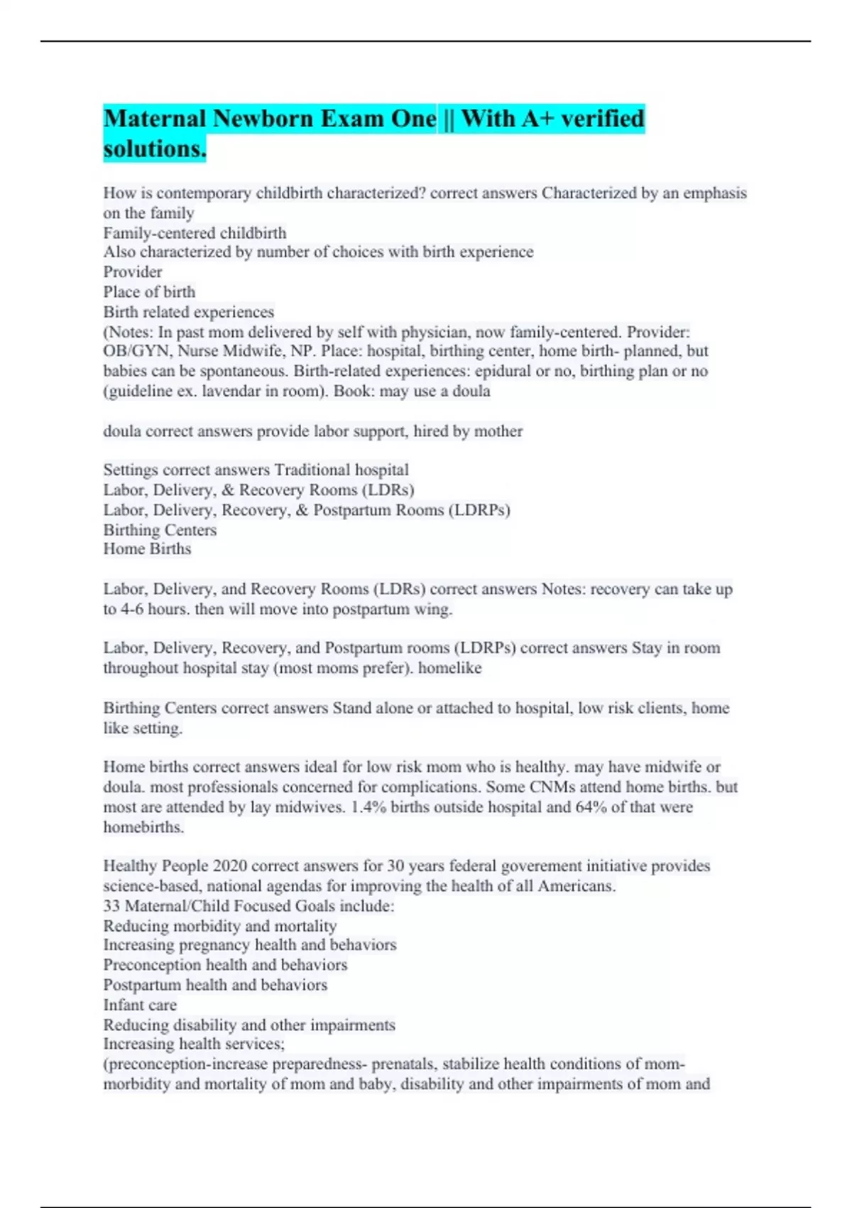 How is contemporary childbirth characterized? correct answers Characterized by an emphasis on the family Family-centered childbirth Also characterized by number of choices with birth experience Provider Place of birth Birth related experiences (Notes: In past mom delivered by self with physician, now family-centered. Provider: OB/GYN, Nurse Midwife, NP. Place: hospital, birthing center, home birth- planned, but babies can be spontaneous. Birth-related experiences: epidural or no, birthing plan or no (guideline ex. lavendar in room). Book: may use a doula doula correct answers provide labor support, hired by mother Settings correct answers Traditional hospital Labor, Delivery, & Recovery Rooms (LDRs) Labor, Delivery, Recovery, & Postpartum Rooms (LDRPs) Birthing Centers Home Births Labor, Delivery, and Recovery Rooms (LDRs) correct answers Notes: recovery can take up to 4-6 hours. then will move into postpartum wing. Labor, Delivery, Recovery, and Postpartum rooms (LDRPs) correct answers Stay in room throughout hospital stay (most moms prefer). homelike Birthing Centers correct answers Stand alone or attached to hospital, low risk clients, home like setting. Home births correct answers ideal for low risk mom who is healthy. may have midwife or doula. most professionals concerned for complications. Some CNMs attend home births. but most are attended by lay midwives. 1.4% births outside hospital and 64% of that were homebirths. Healthy People 2020 correct answers for 30 years federal goverement initiative provides science-based, national agendas for improving the health of all Americans. 33 Maternal/Child Focused Goals include: Reducing morbidity and mortality Increasing pregnancy health and behaviors Preconception health and behaviors Postpartum health and behaviors Infant care Reducing disability and other impairments Increasing health services; (preconception-increase preparedness- prenatals, stabilize health conditions of mom- morbidity and mortality of mom and baby, disability and other impairments of mom and