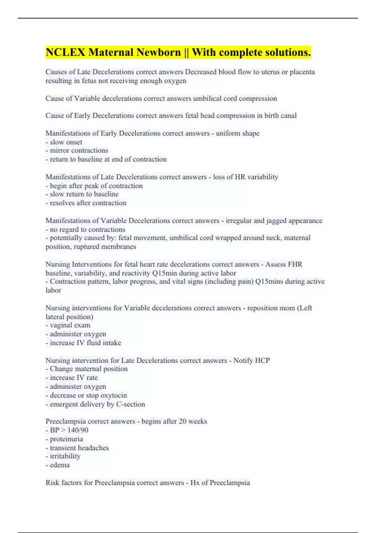 Causes of Late Decelerations correct answers Decreased blood flow to uterus or placenta resulting in fetus not receiving enough oxygen Cause of Variable decelerations correct answers umbilical cord compression Cause of Early Decelerations correct answers fetal head compression in birth canal Manifestations of Early Decelerations correct answers - uniform shape - slow onset - mirror contractions - return to baseline at end of contraction Manifestations of Late Decelerations correct answers - loss of HR variability - begin after peak of contraction - slow return to baseline - resolves after contraction Manifestations of Variable Decelerations correct answers - irregular and jagged appearance - no regard to contractions - potentially caused by: fetal movement, umbilical cord wrapped around neck, maternal position, ruptured membranes Nursing Interventions for fetal heart rate decelerations correct answers - Assess FHR baseline, variability, and reactivity Q15min during active labor - Contraction pattern, labor progress, and vital signs (including pain) Q15mins during active labor Nursing interventions for Variable decelerations correct answers - reposition mom (Left lateral position) - vaginal exam - administer oxygen - increase IV fluid intake Nursing intervention for Late Decelerations correct answers - Notify HCP - Change maternal position - increase IV rate - administer oxygen - decrease or stop oxytocin - emergent delivery by C-section Preeclampsia correct answers - begins after 20 weeks - BP > 140/90 - proteinuria - transient headaches - irritability - edema Risk factors for Preeclampsia correct answers - Hx of Preeclampsia