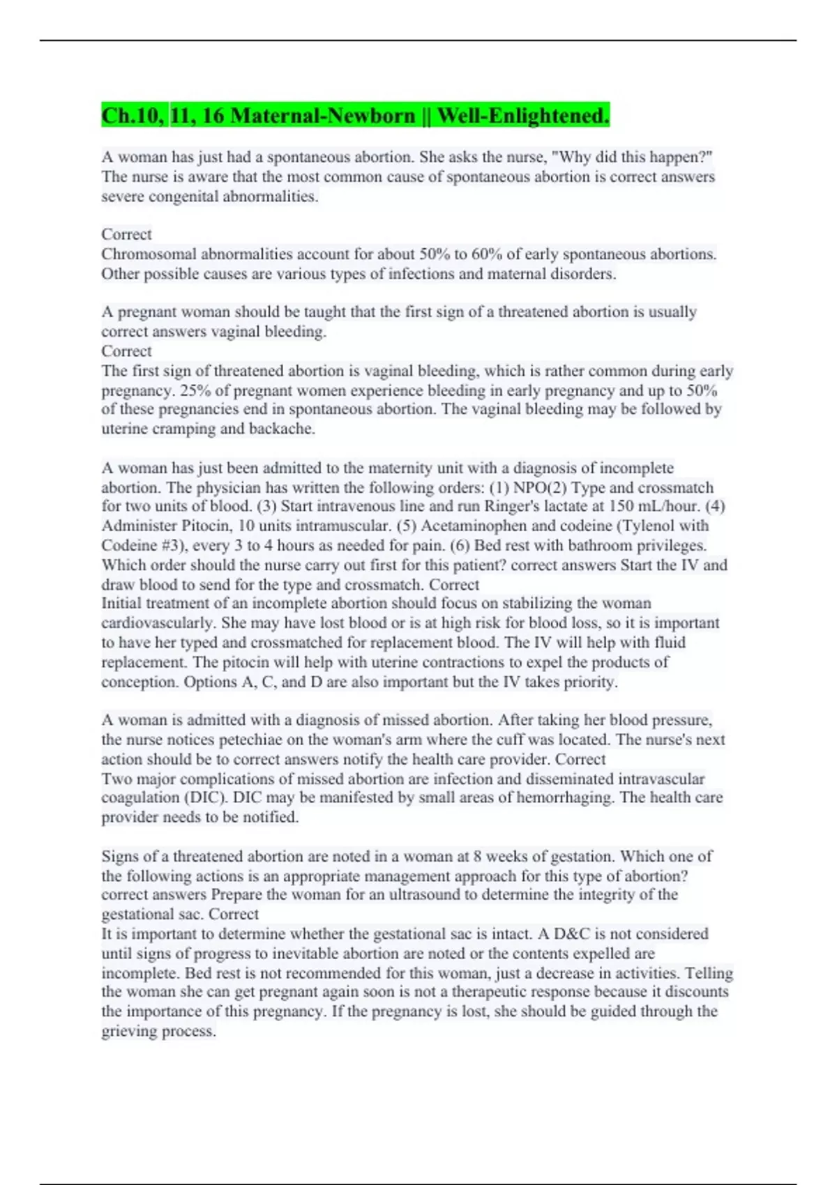 A woman has just had a spontaneous abortion. She asks the nurse, "Why did this happen?" The nurse is aware that the most common cause of spontaneous abortion is correct answers severe congenital abnormalities. Correct Chromosomal abnormalities account for about 50% to 60% of early spontaneous abortions. Other possible causes are various types of infections and maternal disorders. A pregnant woman should be taught that the first sign of a threatened abortion is usually correct answers vaginal bleeding. Correct The first sign of threatened abortion is vaginal bleeding, which is rather common during early pregnancy. 25% of pregnant women experience bleeding in early pregnancy and up to 50% of these pregnancies end in spontaneous abortion. The vaginal bleeding may be followed by uterine cramping and backache. A woman has just been admitted to the maternity unit with a diagnosis of incomplete abortion. The physician has written the following orders: (1) NPO(2) Type and crossmatch for two units of blood. (3) Start intravenous line and run Ringer's lactate at 150 mL/hour. (4) Administer Pitocin, 10 units intramuscular. (5) Acetaminophen and codeine (Tylenol with Codeine #3), every 3 to 4 hours as needed for pain. (6) Bed rest with bathroom privileges. Which order should the nurse carry out first for this patient? correct answers Start the IV and draw blood to send for the type and crossmatch. Correct Initial treatment of an incomplete abortion should focus on stabilizing the woman cardiovascularly. She may have lost blood or is at high risk for blood loss, so it is important to have her typed and crossmatched for replacement blood. The IV will help with fluid replacement. The pitocin will help with uterine contractions to expel the products of conception. Options A, C, and D are also important but the IV takes priority. A woman is admitted with a diagnosis of missed abortion. After taking her blood pressure, the nurse notices petechiae on the woman's arm where the cuff was located. The nurse's next action should be to correct answers notify the health care provider. Correct Two major complications of missed abortion are infection and disseminated intravascular coagulation (DIC). DIC may be manifested by small areas of hemorrhaging. The health care provider needs to be notified. Signs of a threatened abortion are noted in a woman at 8 weeks of gestation. Which one of the following actions is an appropriate management approach for this type of abortion? correct answers Prepare the woman for an ultrasound to determine the integrity of the gestational sac. Correct It is important to determine whether the gestational sac is intact. A D&C is not considered until signs of progress to inevitable abortion are noted or the contents expelled are incomplete. Bed rest is not recommended for this woman, just a decrease in activities. Telling the woman she can get pregnant again soon is not a therapeutic response because it discounts the importance of this pregnancy. If the pregnancy is lost, she should be guided through the grieving process.