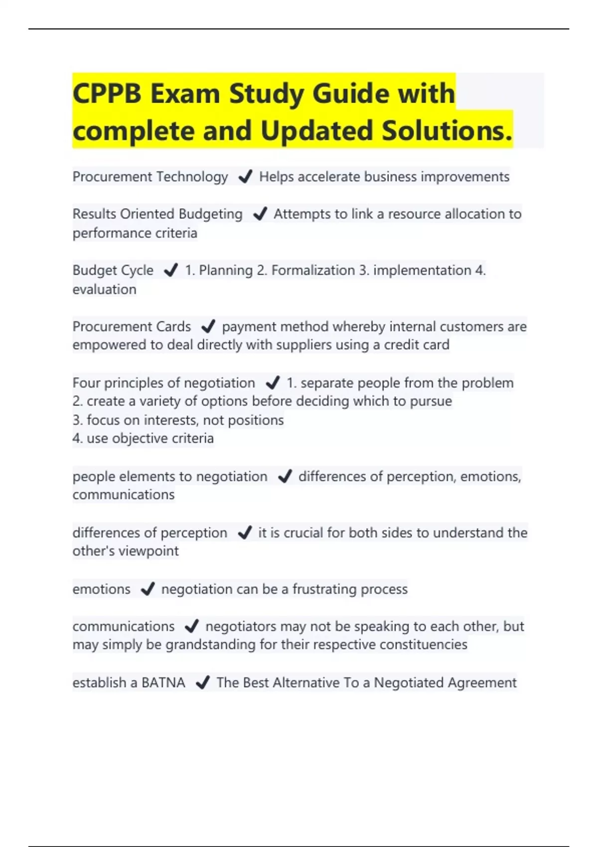 CPPB Exam Study Guide with complete and Updated Solutions |Latest 2024/2025 Procurement Technology ️ Helps accelerate business improvements Results Oriented Budgeting ️ Attempts to link a resource allocation to performance criteria Budget Cycle ️ 1. Planning 2. Formalization 3. implementation 4. evaluation Procurement Cards ️ payment method whereby internal customers are empowered to deal directly with suppliers using a credit card Four principles of negotiation ️ 1. separate people from the problem 2. create a variety of options before deciding which to pursue 3. focus on interests, not positions 4. use objective criteria people elements to negotiation ️ differences of perception, emotions, communications differences of perception ️ it is crucial for both sides to understand the other's viewpoint emotions ️ negotiation can be a frustrating process communications ️ negotiators may not be speaking to each other, but may simply be grandstanding for their respective constituencies establish a BATNA ️ The Best Alternative To a Negotiated Agreement stonewalling ️ this