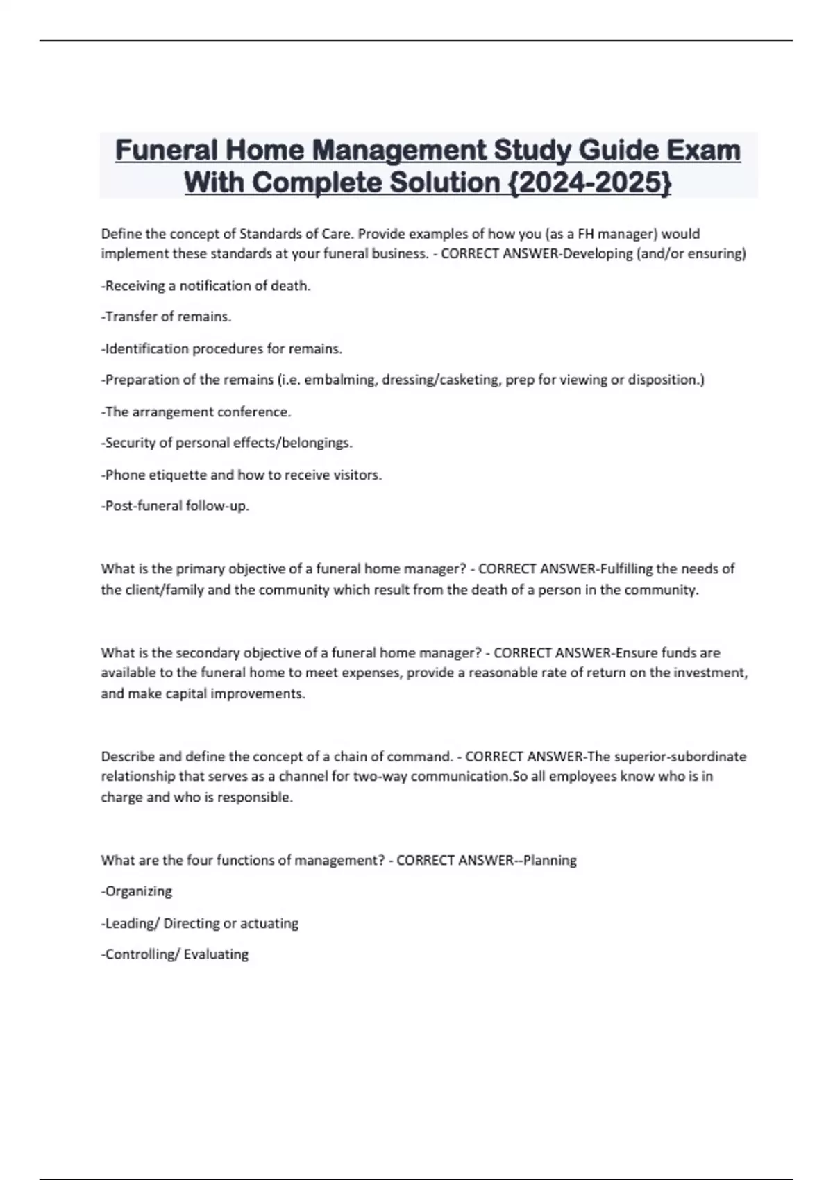 Funeral Home Management Study Guide Exam With Complete Solution {} Define the concept of Standards of Care. Provide examples of how you (as a FH manager) would implement these standards at your funeral business. - CORRECT ANSWER-Developing (and/or ensuring) -Receiving a notification of death. -Transfer of remains. -Identification procedures for remains. -Preparation of the remains (i.e. embalming, dressing/casketing, prep for viewing or disposition.) -The arrangement conference. -Security of personal effects/belongings. -Phone etiquette and how to receive visitors. -Post-funeral follow-up.