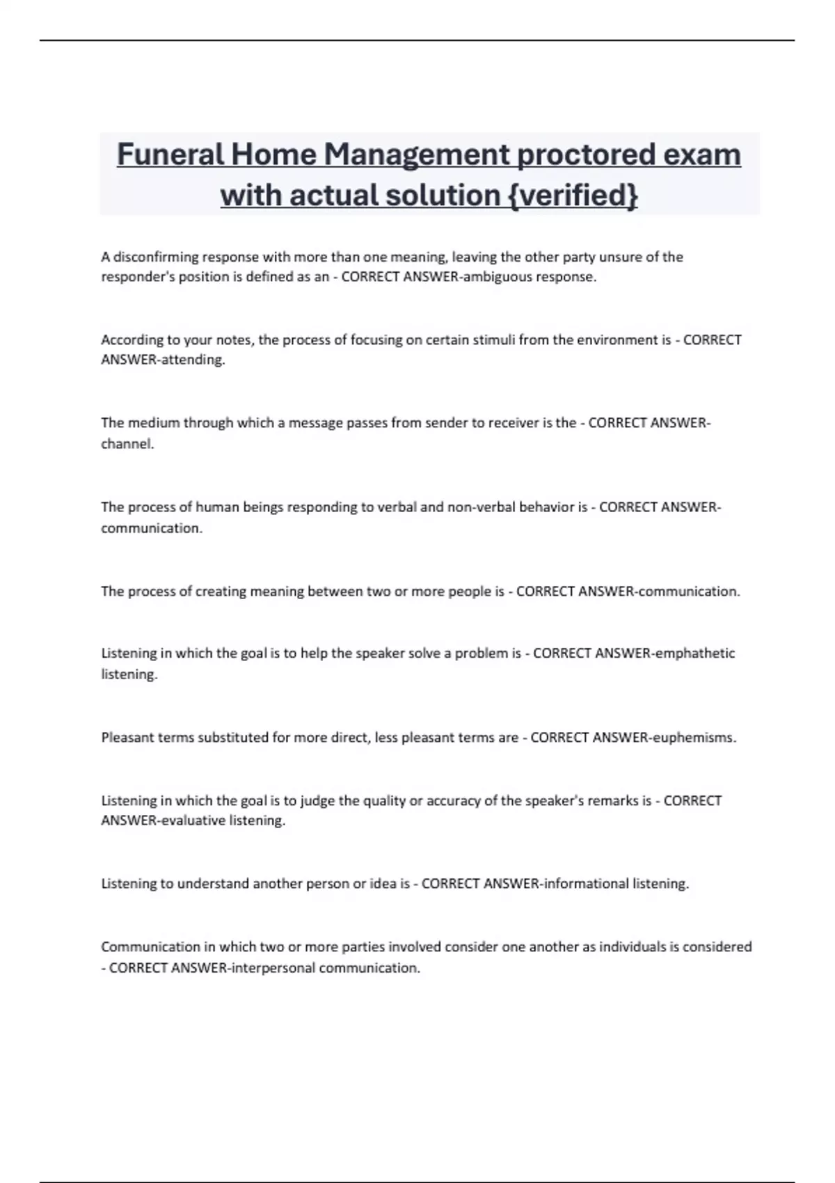 Funeral Home Management proctored exam with actual solution {verified} A disconfirming response with more than one meaning, leaving the other party unsure of the responder's position is defined as an - CORRECT ANSWER-ambiguous response. According to your notes, the process of focusing on certain stimuli from the environment is - CORRECT ANSWER-attending. The medium through which a message passes from sender to receiver is the - CORRECT ANSWERchannel. The process of human beings responding to verbal and non-verbal behavior is - CORRECT ANSWERcommunication.