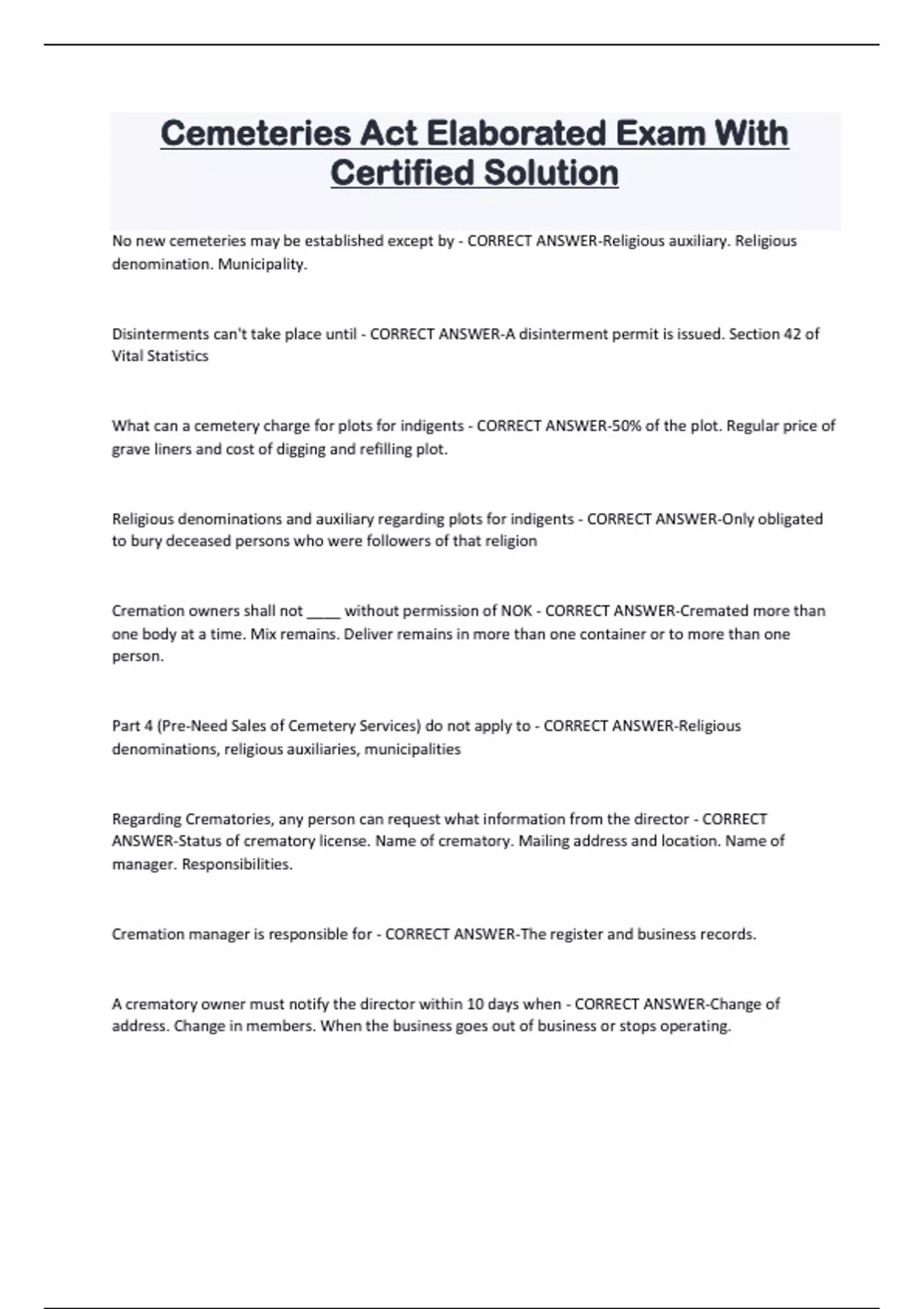 Cemeteries Act Elaborated Exam With Certified Solution No new cemeteries may be established except by - CORRECT ANSWER-Religious auxiliary. Religious denomination. Municipality. Disinterments can't take place until - CORRECT ANSWER-A disinterment permit is issued. Section 42 of Vital Statistics What can a cemetery charge for plots for indigents - CORRECT ANSWER-50% of the plot. Regular price of grave liners and cost of digging and refilling plot.