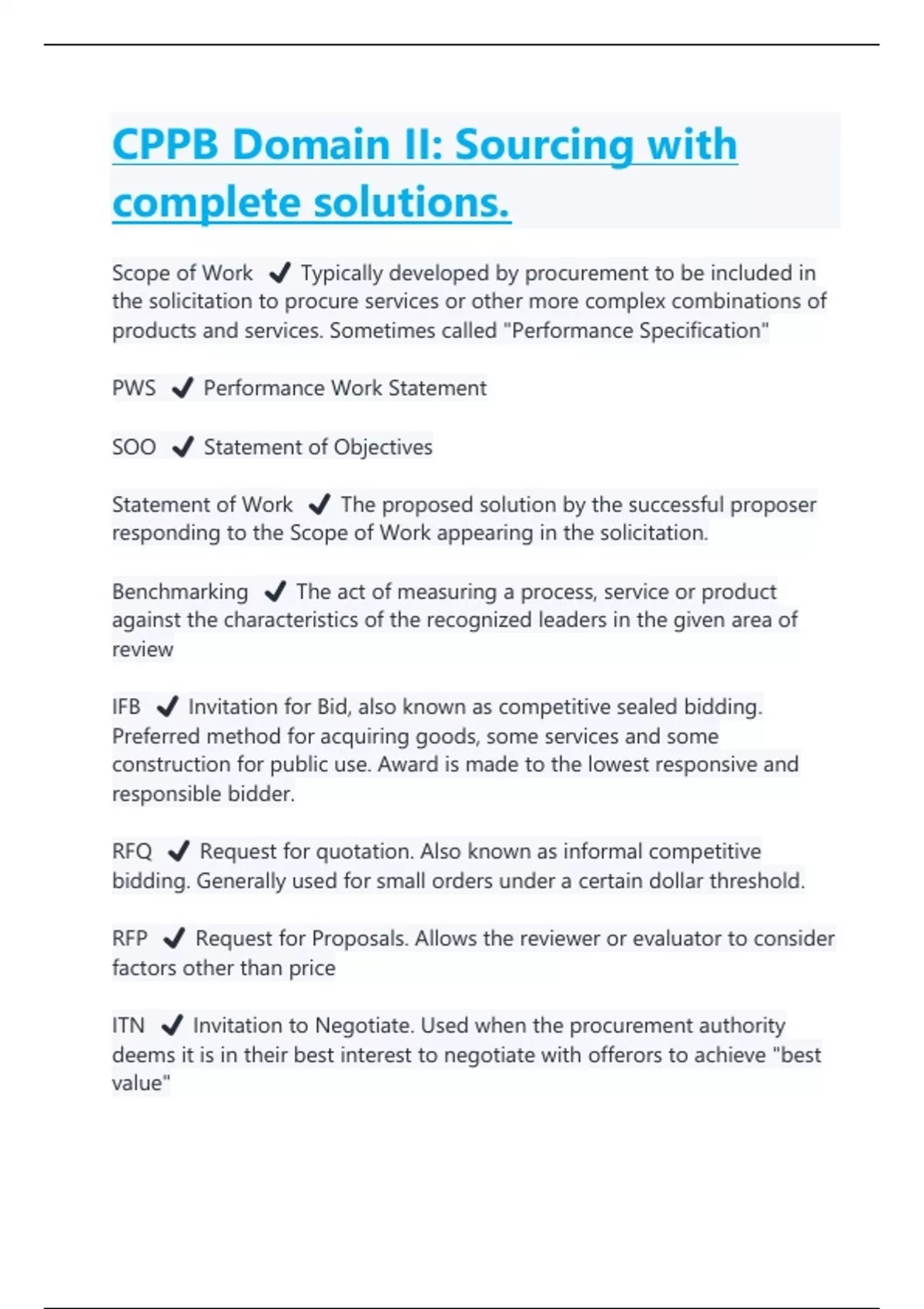 CPPB Domain II: Sourcing with complete solutions. Scope of Work ️ Typically developed by procurement to be included in the solicitation to procure services or other more complex combinations of products and services. Sometimes called "Performance Specification" PWS ️ Performance Work Statement SOO ️ Statement of Objectives Statement of Work ️ The proposed solution by the successful proposer responding to the Scope of Work appearing in the solicitation. Benchmarking ️ The act of measuring a process, service or product against the characteristics of the recognized leaders in the given area of review IFB ️ Invitation for Bid, also known as competitive sealed bidding. Preferred method for acquiring goods, some services and some construction for public use. Award is made to the lowest responsive and responsible bidder. RFQ ️ Request for quotation. Also known as informal competitive bidding. Generally used for small orders under a certain dollar threshold. RFP ️ Request for Proposals. Allows the reviewer or evaluator to consider factors other than price ITN ️ Invitation to Negotiate. Used when the procurement authority deems it is in their best interest to negotiate with offerors to achieve "best value
