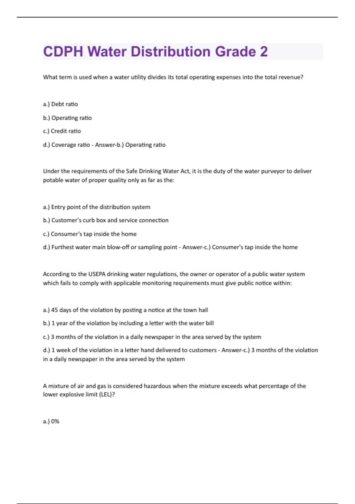 What term is used when a water utility divides its total operating expenses into the total revenue? a.) Debt ratio b.) Operating ratio c.) Credit ratio d.) Coverage ratio - Answer-b.) Operating ratio Under the requirements of the Safe Drinking Water Act, it is the duty of the water purveyor to deliver potable water of proper quality only as far as the: a.) Entry point of the distribution system b.) Customer's curb box and service connection c.) Consumer's tap inside the home d.) Furthest water main blow-off or sampling point - Answer-c.) Consumer's tap inside the home According to the USEPA drinking water regulations, the owner or operator of a public water system which fails to comply with applicable monitoring requirements must give public notice within: a.) 45 days of the violation by posting a notice at the town hall b.) 1 year of the violation by including a letter with the water bill c.) 3 months of the violation in a daily newspaper in the area served by the system d.) 1 week of the violation in a letter hand delivered to customers - Answer-c.) 3 months of the violation in a daily newspaper in the area served by the system A mixture of air and gas is considered hazardous when the mixture exceeds what percentage of the lower explosive limit (LEL)? a.) 0%b.) 3% c.) 7% d.) 10% - Answer-d.) 10% Which of the following duties should not be performed by a small system operator? a.) Disinfect water mains b.) Observe pump motors to detect unusual noises, vibrations, or excessive heat c.) Repair and overhaul chlorinators d.) Wire pump, compressors and electrical components of the water system - Answer-d.) Wire pump, compressors and electrical components of the water system Which form of hypochlorite is the most dangerous to handle? a.) Sodium b.) Fluoride c.) Calcium d.) Chlorine - Answer-c.) Calcium What type of fire extinguisher should be used for fires with live electricity present? a.) Class A b.) Class B c.) Class C d.) Class D - Answer-c.) Class C To ensure that the water supplied by a public water system meets federal and state requirements, the water system operator must regularly collect samples and:a.) Test the water at the nearest water testing laboratory b.) Determine a sampling schedule based on the lab's recommendations c.) Send all analysis results to the State periodically d.) Count the number of active wells in the system - Answer-c.) Send all analysis results to the State periodically How many coliform samples are required per month for a water system serving a population between 25 and 100? a.) 1 b.) 2 c.) 3 d.) 4 - Answer-a.) 1 What test method best determines chemical feed/dosage rates? a.) Jar b.) Turbidity c.) Hammer d.) Hardness - Answer-a.) Jar
