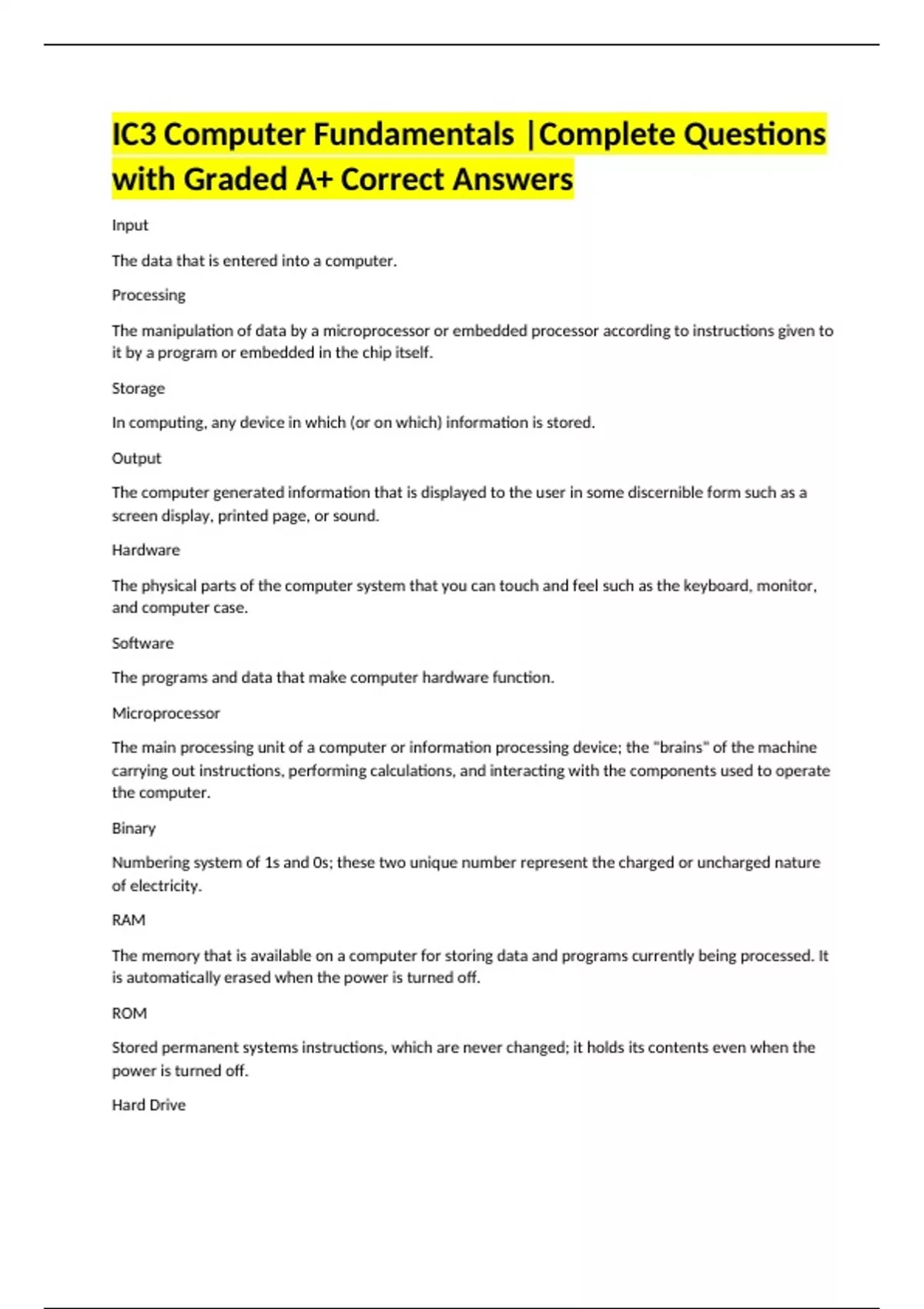 IC3 Computer Fundamentals |Complete Questions with Graded A+ Correct Answers Input The data that is entered into a computer. Processing The manipulation of data by a microprocessor or embedded processor according to instructions given to it by a program or embedded in the chip itself. Storage In computing, any device in which (or on which) information is stored. Output The computer generated information that is displayed to the user in some discernible form such as a screen display, printed page, or sound. Hardware The physical parts of the computer system that you can touch and feel such as the keyboard, monitor, and computer case. Software The programs and data that make computer hardware function. Microprocessor The main processing unit of a computer or information processing device; the "brains" of the machine carrying out instructions, performing calculations, and interacting with the components used to operate the computer. Binary Numbering system of 1s and 0s; these two unique number represent the charged or uncharged nature of electricity. RAM The memory that is available on a computer for storing data and programs currently being processed. It is automatically erased when the power is turned off. ROM Stored permanent systems instructions, which are never changed; it holds its contents even when the power is turned off. Hard Drive