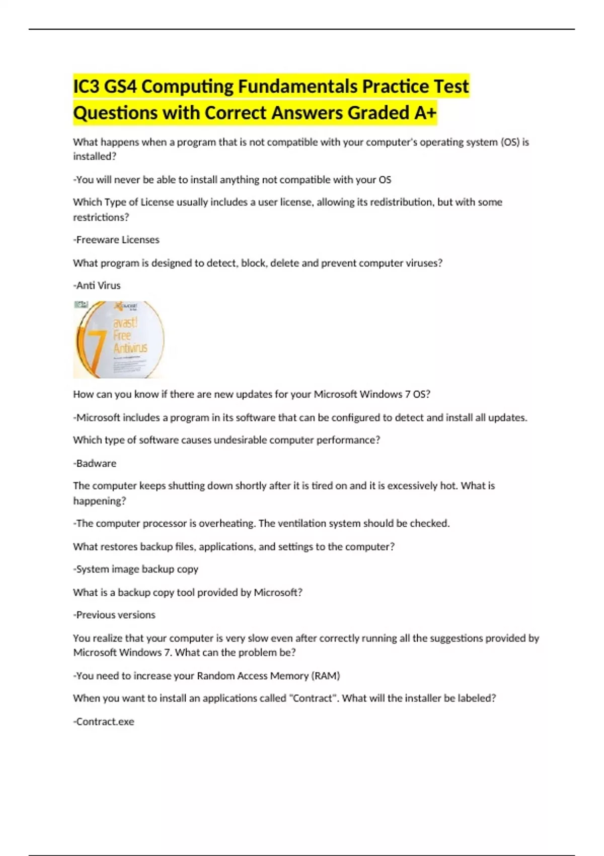 IC3 GS4 Computing Fundamentals Practice Test Questions with Correct Answers Graded A+ What happens when a program that is not compatible with your computer's operating system (OS) is installed? -You will never be able to install anything not compatible with your OS Which Type of License usually includes a user license, allowing its redistribution, but with some restrictions? -Freeware Licenses What program is designed to detect, block, delete and prevent computer viruses? -Anti Virus How can you know if there are new updates for your Microsoft Windows 7 OS? -Microsoft includes a program in its software that can be configured to detect and install all updates. Which type of software causes undesirable computer performance? -Badware The computer keeps shutting down shortly after it is tired on and it is excessively hot. What is happening? -The computer processor is overheating. The ventilation system should be checked. What restores backup files, applications, and settings to the computer? -System image backup copy What is a backup copy tool provided by Microsoft? -Previous versions You realize that your computer is very slow even after correctly running all the suggestions provided by Microsoft Windows 7. What can the problem be? -You need to increase your Random Access Memory (RAM) When you want to install an applications called "Contract". What will the installer be labeled? -C