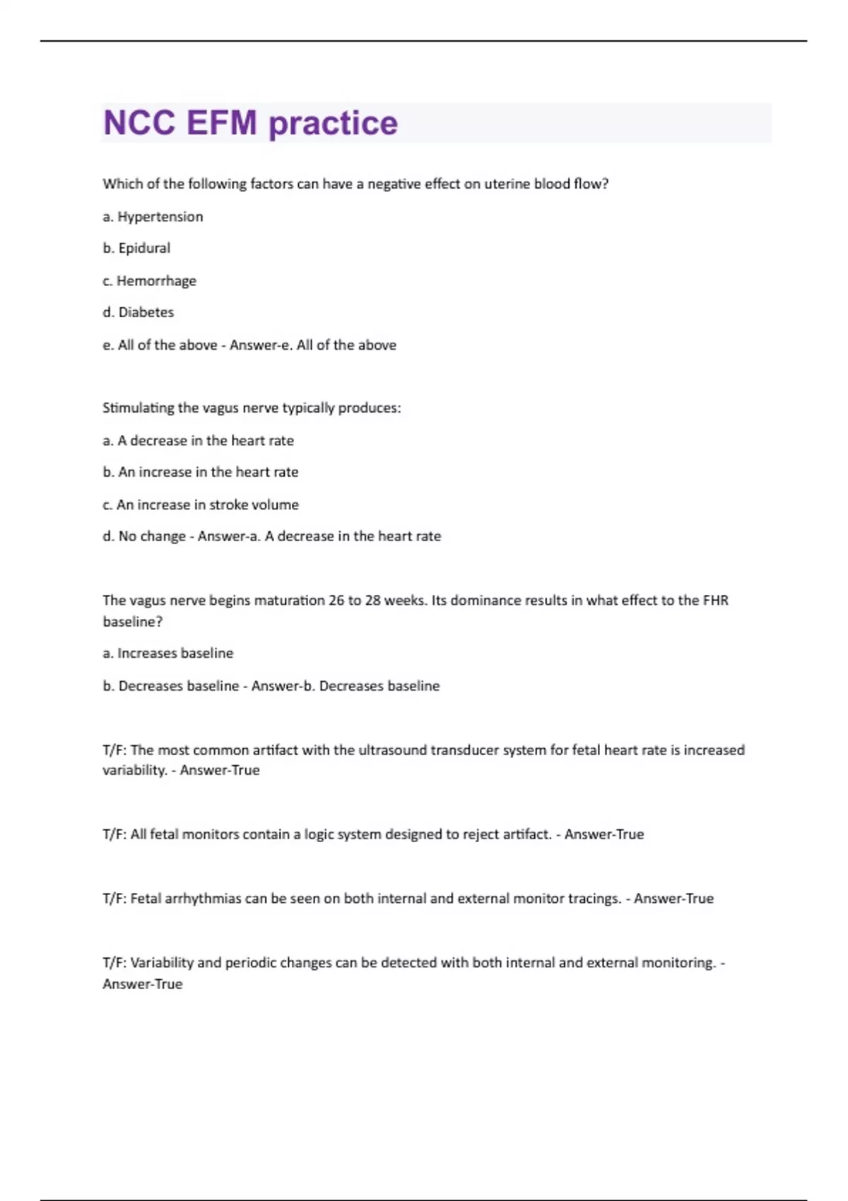 Which of the following factors can have a negative effect on uterine blood flow? a. Hypertension b. Epidural c. Hemorrhage d. Diabetes e. All of the above - Answer-e. All of the above Stimulating the vagus nerve typically produces: a. A decrease in the heart rate b. An increase in the heart rate c. An increase in stroke volume d. No change - Answer-a. A decrease in the heart rate The vagus nerve begins maturation 26 to 28 weeks. Its dominance results in what effect to the FHR baseline? a. Increases baseline b. Decreases baseline - Answer-b. Decreases baseline T/F: The most common artifact with the ultrasound transducer system for fetal heart rate is increased variability. - Answer-True T/F: All fetal monitors contain a logic system designed to reject artifact. - Answer-True T/F: Fetal arrhythmias can be seen on both internal and external monitor tracings. - Answer-True T/F: Variability and periodic changes can be detected with both internal and external monitoring. - Answer-TrueT/F: Variable decelerations are a vagal response. - Answer-True T/F: Variable decelerations are the most frequently seen fetal heart rate deceleration pattern in labor. - Answer-True Etiology of a baseline FHR of 165bpm occurring for the last hour can be: 1. Maternal supine hypotension 2. Maternal fever 3. Maternal dehydration 4. Unknown a. 1 and 2 b. 1, 2 and 3 c. 2, 3 and 4 - Answer-c. 2, 3 and 4 The most prevalent risk factor associated with fetal death before the onset of labor is: a. Low socioeconomic status b. Fetal malpresentation c. Uteroplacental insufficiency d. Uterine anomalies - Answer-c. Uteroplacental insufficiency Which of the following conditions is not an indication for antepartum fetal surveillance? a. Gestational hypertension b. Diabetes in pregnancy c. Fetus in breech presentation d. Decreased fetal movement - Answer-c. Fetus in breech presentation