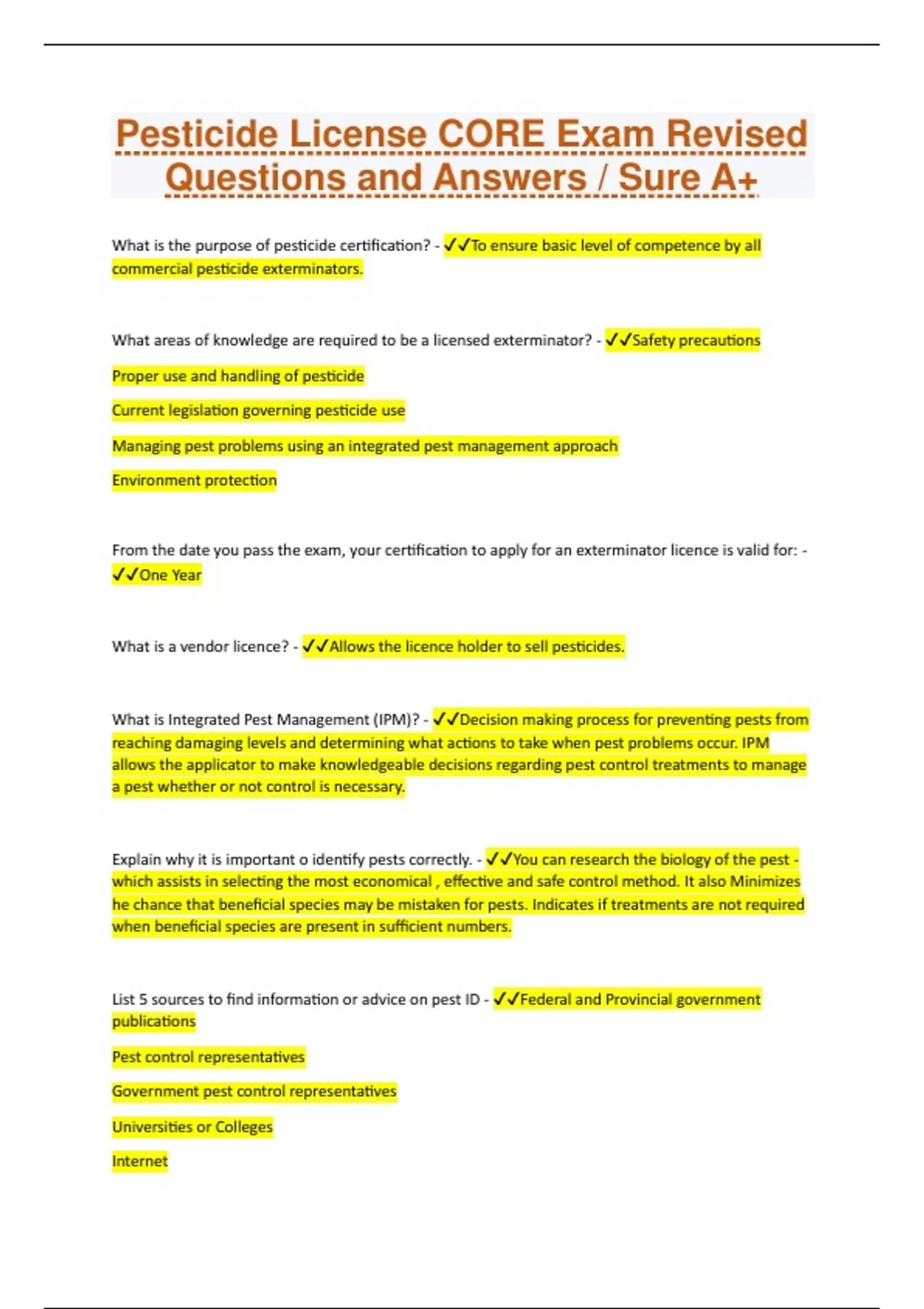 Pesticide License CORE Exam Revised Questions and Answers / Sure A+