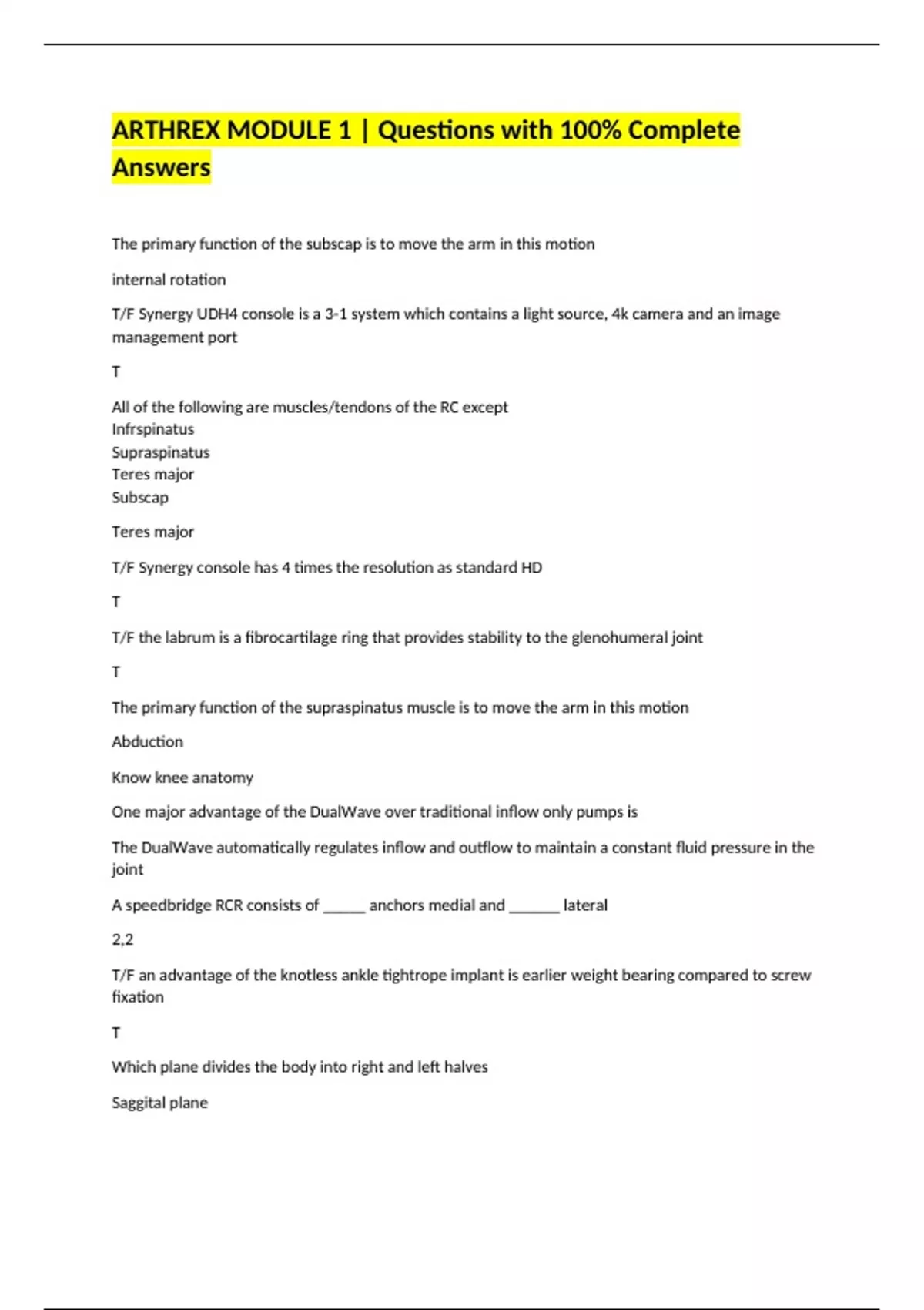 ARTHREX MODULE 1 | Questions with 100% Complete Answers The primary function of the subscap is to move the arm in this motion internal rotation T/F Synergy UDH4 console is a 3-1 system which contains a light source, 4k camera and an image management port T All of the following are muscles/tendons of the RC except Infrspinatus Supraspinatus Teres major Subscap Teres major T/F Synergy console has 4 times the resolution as standard HD T T/F the labrum is a fibrocartilage ring that provides stability to the glenohumeral joint T The primary function of the supraspinatus muscle is to move the arm in this motion Abduction Know knee anatomy One major advantage of the DualWave over traditional inflow only pumps is The DualWave automatically regulates inflow and outflow to maintain a constant fluid pressure in the joint A speedbridge RCR consists of _____ anchors medial and ______ lateral 2,2 T/F an advantage of the knotless ankle tightrope implant is earlier weight bearing compared to screw fixation T Which plane divides the body into right and left halves Saggital plane