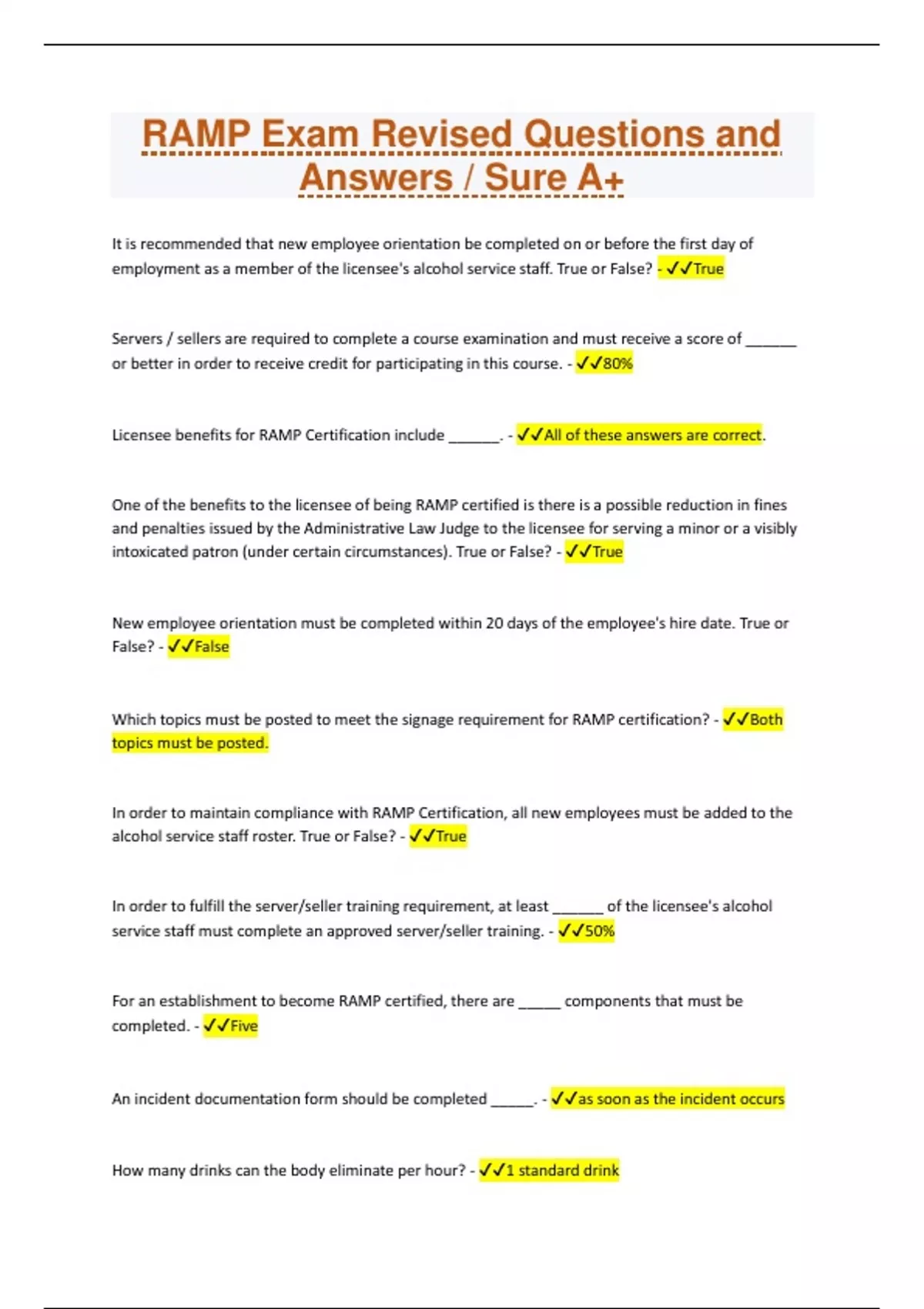 It is recommended that new employee orientation be completed on or before the first day of employment as a member of the licensee's alcohol service staff. True or False? - True Servers / sellers are required to complete a course examination and must receive a score of ______ or better in order to receive credit for participating in this course. - 80% Licensee benefits for RAMP Certification include ______. - All of these answers are correct. One of the benefits to the licensee of being RAMP certified is there is a possible reduction in fines and penalties issued by the Administrative Law Judge to the licensee for serving a minor or a visibly intoxicated patron (under certain circumstances). True or False? - True
