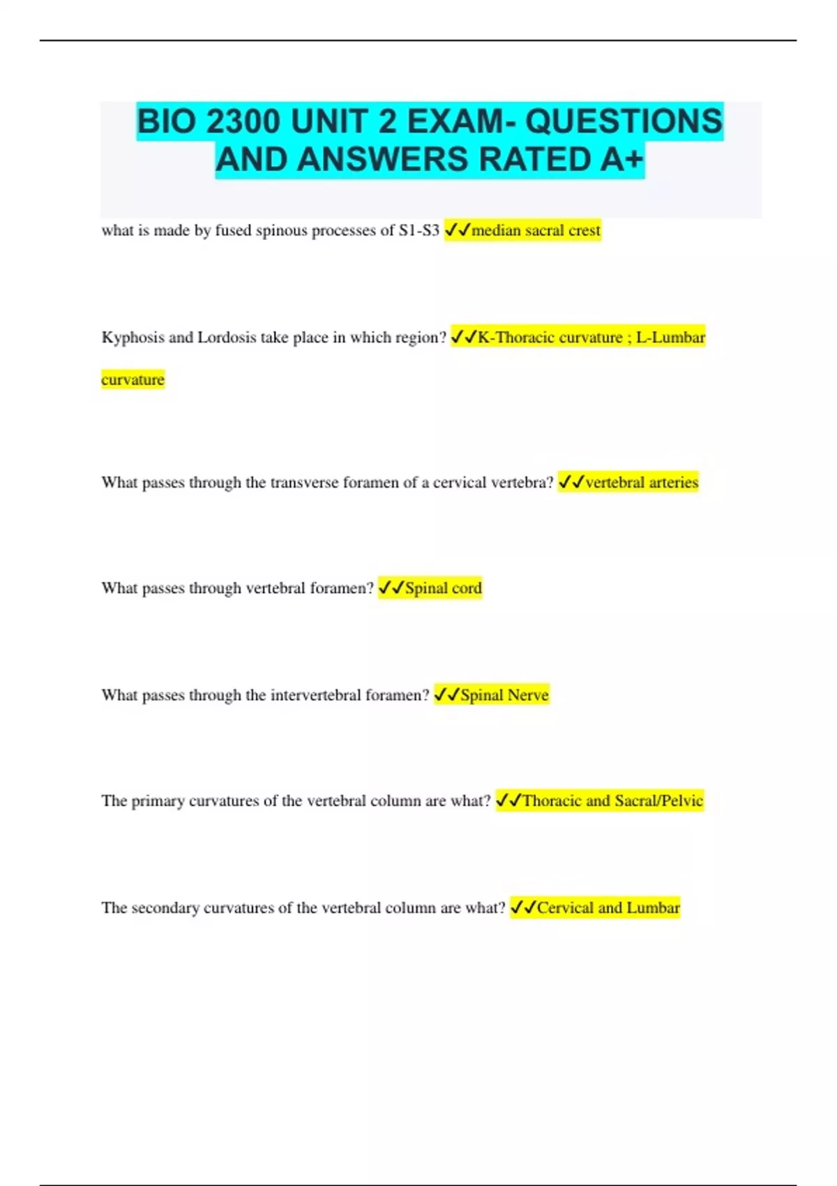 BIO 2300 UNIT 2 EXAM- QUESTIONS AND ANSWERS RATED A+ what is made by fused spinous processes of S1-S3 median sacral crest Kyphosis and Lordosis take place in which region? K-Thoracic curvature ; L-Lumbar curvature What passes through the transverse foramen of a cervical vertebra? vertebral arteries What passes through vertebral foramen? Spinal cord What passes through the intervertebral foramen? Spinal Nerve The primary curvatures of the vertebral column are what? Thoracic and Sacral/Pelvic The secondary curvatures of the vertebral column are what? Cervical and Lumbar Herniated Disc happens commonly in what direction? Why? Post lateral direction because of lack of support What muscle wrinkles the forehead? Occipitofrontalis frontal belly What muscle helps you to wink and blink? Orbicularis oculi What muscle helps you smile? Zygomaticus What muscle helps you blow a balloon? Buccinators What muscle helps you to flex your neck? SCM What muscles helps you to extend your neck? Splenius capitis and splenius cervicis muscle What muscle helps you to extend vertebral column? Erector Spinae What are the muscles of mastication? Temporalis, masseters , lateral pterygoid, and medial pterygoid What is the only bone that does not articulate with another bone? Hyoid Bone What is the muscle that divides the neck into anterior Triangle and posterior Triangle? SCM What muscle attaches to the scapula and the hyoid