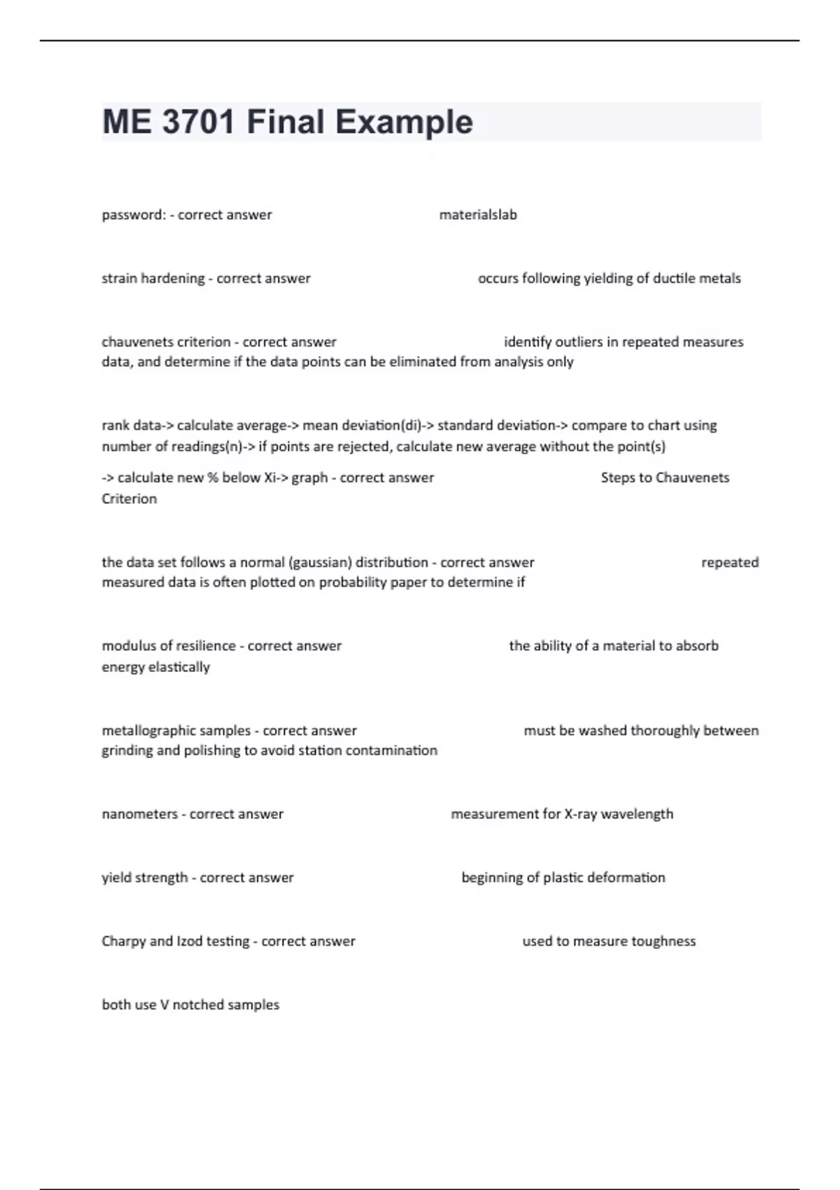 password: - correct answer materialslab strain hardening - correct answer occurs following yielding of ductile metals chauvenets criterion - correct answer identify outliers in repeated measures data, and determine if the data points can be eliminated from analysis only rank data-> calculate average-> mean deviation(di)-> standard deviation-> compare to chart using number of readings(n)-> if points are rejected, calculate new average without the point(s) -> calculate new % below Xi-> graph - correct answer Steps to Chauvenets Criterion the data set follows a normal (gaussian) distribution - correct answer repeated measured data is often plotted on probability paper to determine if modulus of resilience - correct answer the ability of a material to absorb energy elastically metallographic samples - correct answer must be washed thoroughly between grinding and polishing to avoid station contamination nanometers - correct answer measurement for X-ray wavelength yield strength - correct answer beginning of plastic deformation Charpy and Izod testing - correct answer used to measure toughness both use V notched samples Charpy test: specimen placed horizontal with v-notched faced away from the hammer Izod: specimen placed vertical with v-notch facing toward hammer - correct answer Difference between Charpy and Izod testing Rockwell testing - correct answer used to determine HARDNESS of steel-- consists of measuring additional depth to which an indenter is forced by a heavy(major) load beyond the depth of previously applied light (minor) load Difference between Rockwell and Brinell Hardness Tests? Rockwell- hardness is determined by measuring the DEPTH of the indentation Brinell- hardness is measured by indentation SIZE - correct answer Difference between Rockwell and Brinell Hardness Tests? eliminates backlash in the load train, and causes indenter to break through slight surface roughness and to crush particles of foreign matter--> much greater accuracy in test - correct answer What is the benefit of first applying a minor load to the specimen before the major load in Rockwell hardness testing?eliminates backlash in the load train, and Aluminum alloys, Copper Alloys, soft steels, malleable iron - correct answer When do you use B scale for Hardness Testing? Steel, and other metals harder than 100 HRB - correct answer When do you use C scale for Hardness Testing? 60 HRC - correct answer How do you write the result of a hardness test on the C scale with a reading of 60? 80 HRB - correct answer How do you write the result of a hardness test on the B scale with a reading of 80? Austempering - correct answer used to facilitate formation of bainite (hard and brittle microstructure), quench in salt bath then cool at room temp Annealing - correct answer applied to relieve internal stresses and increase strength through recrystallization, age hardening (without over aging) - correct answer formation of coherent precipitates increases the hardness and strength of a material solution treatment- to minimize segregation in the alloy, quenching - to create a supersaturated solid solution, aging- to facilitate the formation of coherent precipitates which strengthen the alloy by interfering with dislocation movement - correct answer steps for heat treatment (precipitation hardening) of Al alloy and their purpose best = 3wt%cu, worst=pure aluminum this is because to hardening comes from solid solution that decreases solid solubility as temp decreases.. this requires being the alpha region (homogeneous solid solution) and alpha + theta region which occurs around 3-4wt%cu - correct answer which is best and worst for precipitation hardening out of pure aluminum, 3wt%cu, and 8wt%cu and WHY hardness - correct answer measure of materials resistance to localized plastic deformation (e.g., small dent or scratch) toughness - correct answer measure of the amount of energy a material can absorb before fracture hardenability (use Jominy End Quench Test) - correct answer ability to become more hard by quenching minor load in rockwell test - correct answer flattens the surface and ensures no debris causes errors in reading ductile fracture - correct answer more energy is absorbed because material is allowed to strain more while withstanding higher forces, energy under curve is greater