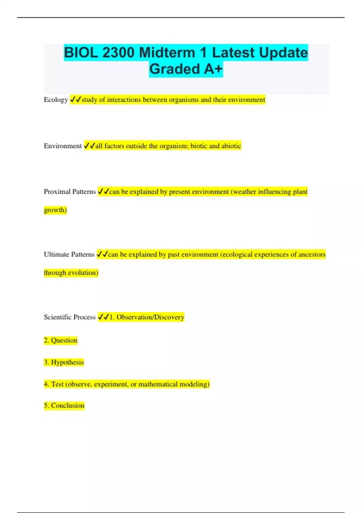BIOL 2300 Midterm 1 Latest Update Graded A+ Ecology study of interactions between organisms and their environment Environment all factors outside the organism; biotic and abiotic Proximal Patterns can be explained by present environment (weather influencing plant growth) Ultimate Patterns can be explained by past environment (ecological experiences of ancestors through evolution) Scientific Process 1. Observation/Discovery 2. Question 3. Hypothesis 4. Test (observe, experiment, or mathematical modeling) 5. Conclusion Null hypothesis no change or relationship Alternate hypothesis Prediction of change or relationship Population -a group of individuals of one species living together -where evolutionary change occurs/is revealed Homozygote has the same alleles at a particular locus on the pair of chomosomes Heterozygote has different alleles at a particular locus Alleles two or more alternative forms of a gene Genotype all genetic characteristics of an individual Phenotype -interaction of the genotype of an individual with its environment -how the genetic instructions are expressed Phenotypic Plasticity ability of individual to change its phenotype in response to changes in environmental conditions PP discrete forms When phenotype can be expresses as one of two (or more) options, depending on the environment. (ex. bees) PP continuous forms When phenotype has a range of how it can be expressed depending on the environment (ex. size of fish depending on food available) Evolution change in the genetic composition