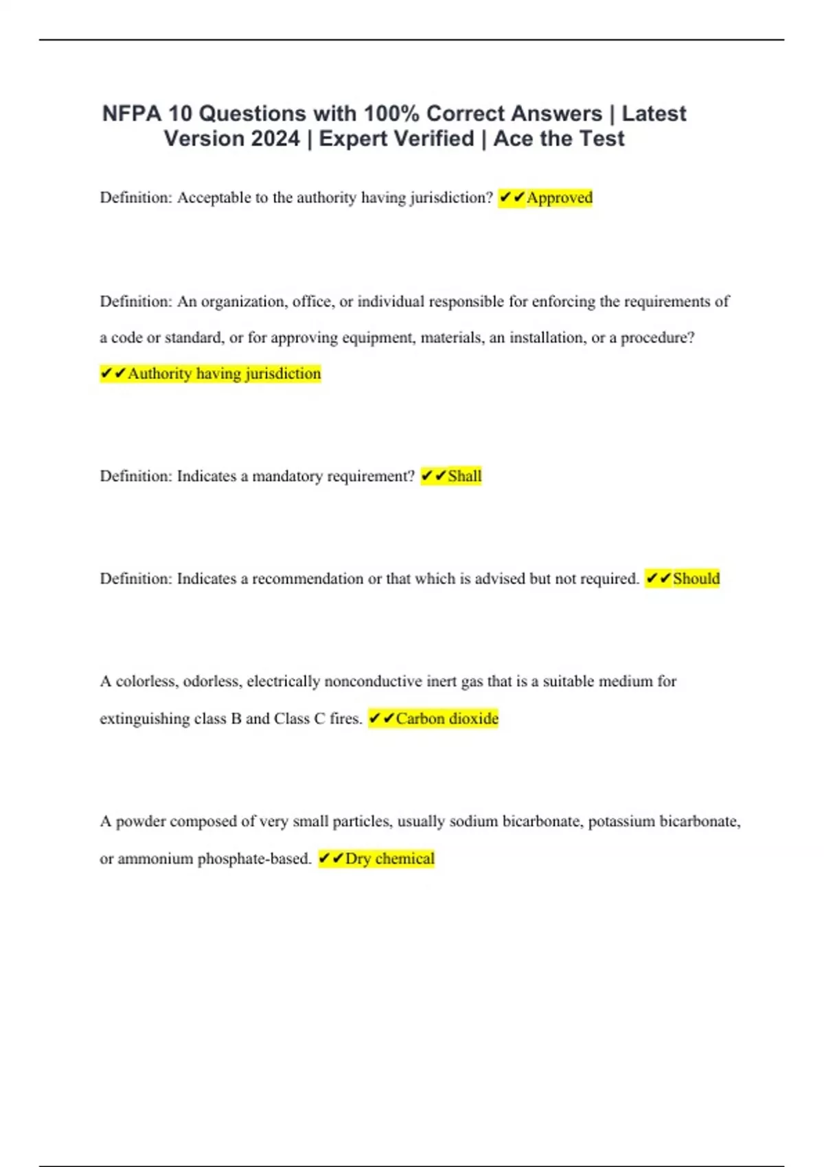 NFPA 10 Questions with 100% Correct Answers | Latest Version 2024 | Expert Verified | Ace the Test