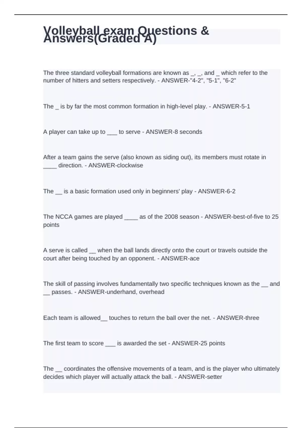 Volleyball exam Questions & Answers(Graded A)