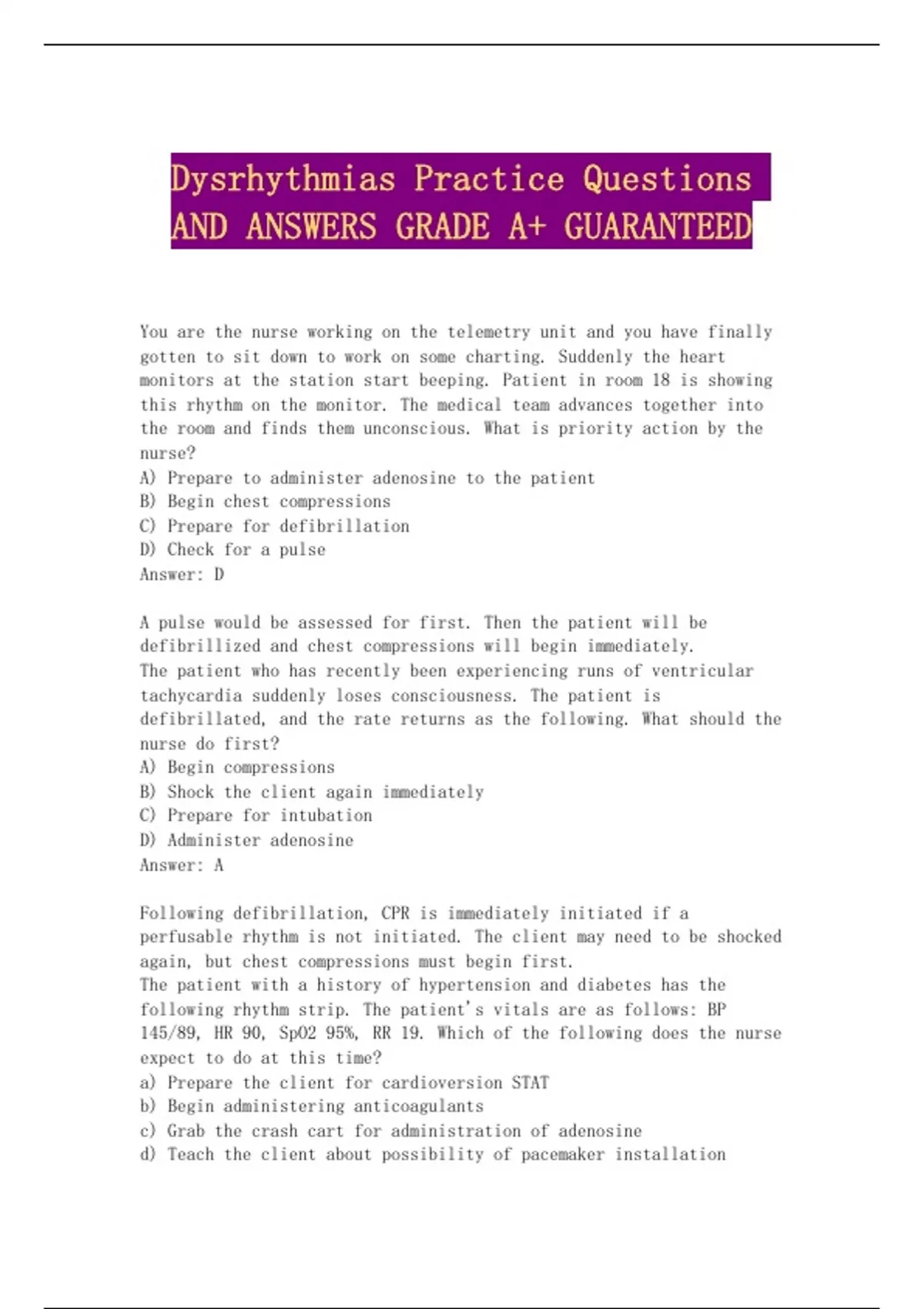 Dysrhythmias Practice Questions AND ANSWERS GRADE A+ GUARANTEED