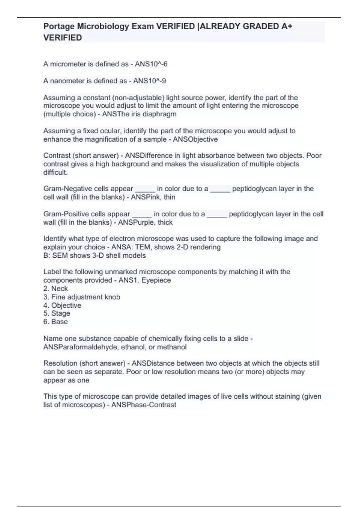 Portage Microbiology Exam VERIFIED ALREADY GRADED A+ VERIFIED