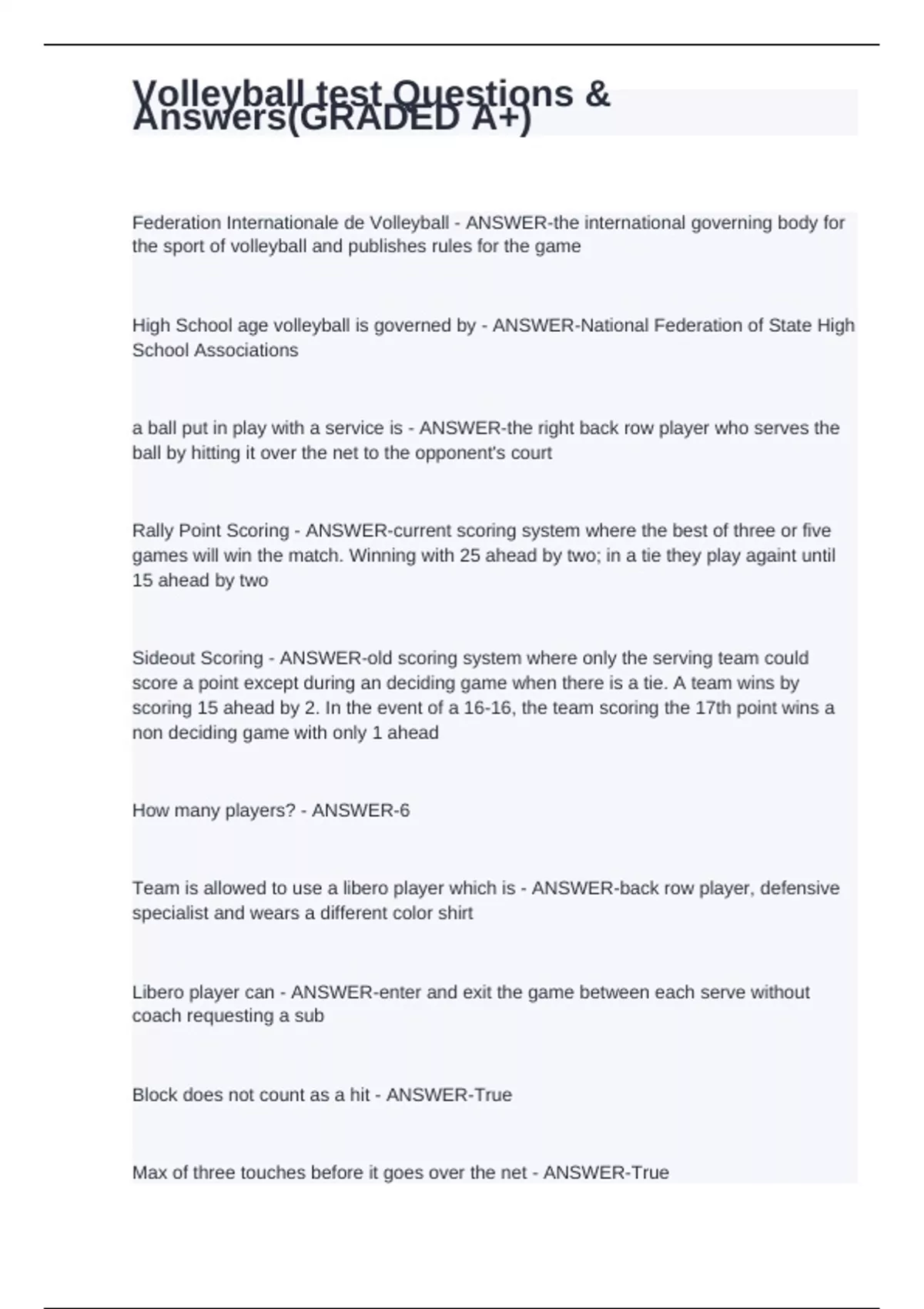 High School age volleyball is governed by - ANSWER-National Federation of State High School Associations a ball put in play with a service is - ANSWER-the right back row player who serves the ball by hitting it over the net to the opponent's court Rally Point Scoring - ANSWER-current scoring system where the best of three or five games will win the match. Winning with 25 ahead by two; in a tie they play againt until 15 ahead by two Sideout Scoring - ANSWER-old scoring system where only the serving team could score a point except during an deciding game when there is a tie. A team wins by scoring 15 ahead by 2. In the event of a 16-16, the team scoring the 17th point wins a non deciding game with only 1 ahead How many players? - ANSWER-6 Team is allowed to use a libero player which is - ANSWER-back row player, defensive specialist and wears a different color shirt Libero player can - ANSWER-enter and exit the game between each serve without coach requesting a sub Block does not count as a hit - ANSWER-True