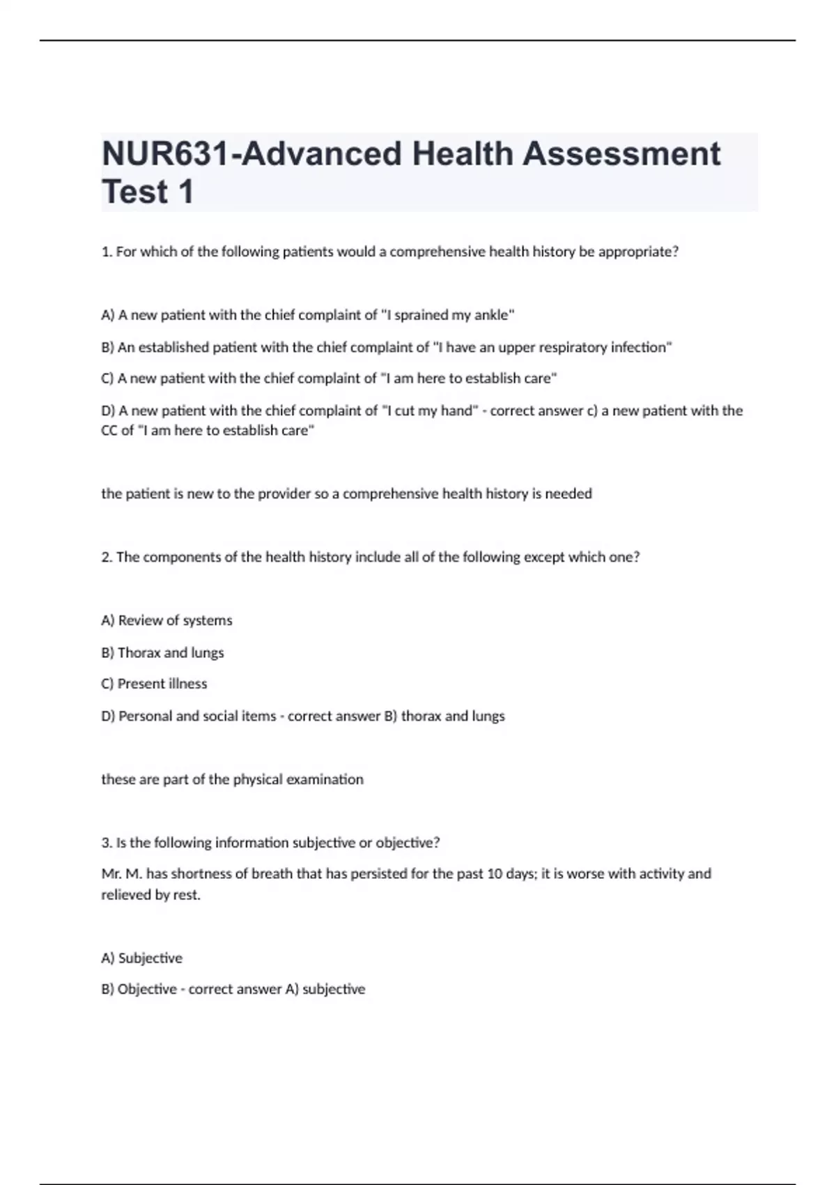 NUR631-Advanced Health Assessment Test 1 fully solved rated A+ 1. For which of the following patients would a comprehensive health history be appropriate? A) A new patient with the chief complaint of "I sprained my ankle" B) An established patient with the chief complaint of "I have an upper respiratory infection" C) A new patient with the chief complaint of "I am here to establish care" D) A new patient with the chief complaint of "I cut my hand" - correct answer c) a new patient with the CC of "I am here to establish care" the patient is new to the provider so a comprehensive health history is needed 2. The components of the health history include all of the following except which one? A) Review of systems B) Thorax and lungs C) Present illness D) Personal and social items - correct answer B) thorax and lungs these are part of the physical examination 3. Is the following information subjective or objective? Mr. M. has shortness of breath that has persisted for the past 10 days; it is worse with activity and relieved by rest.
