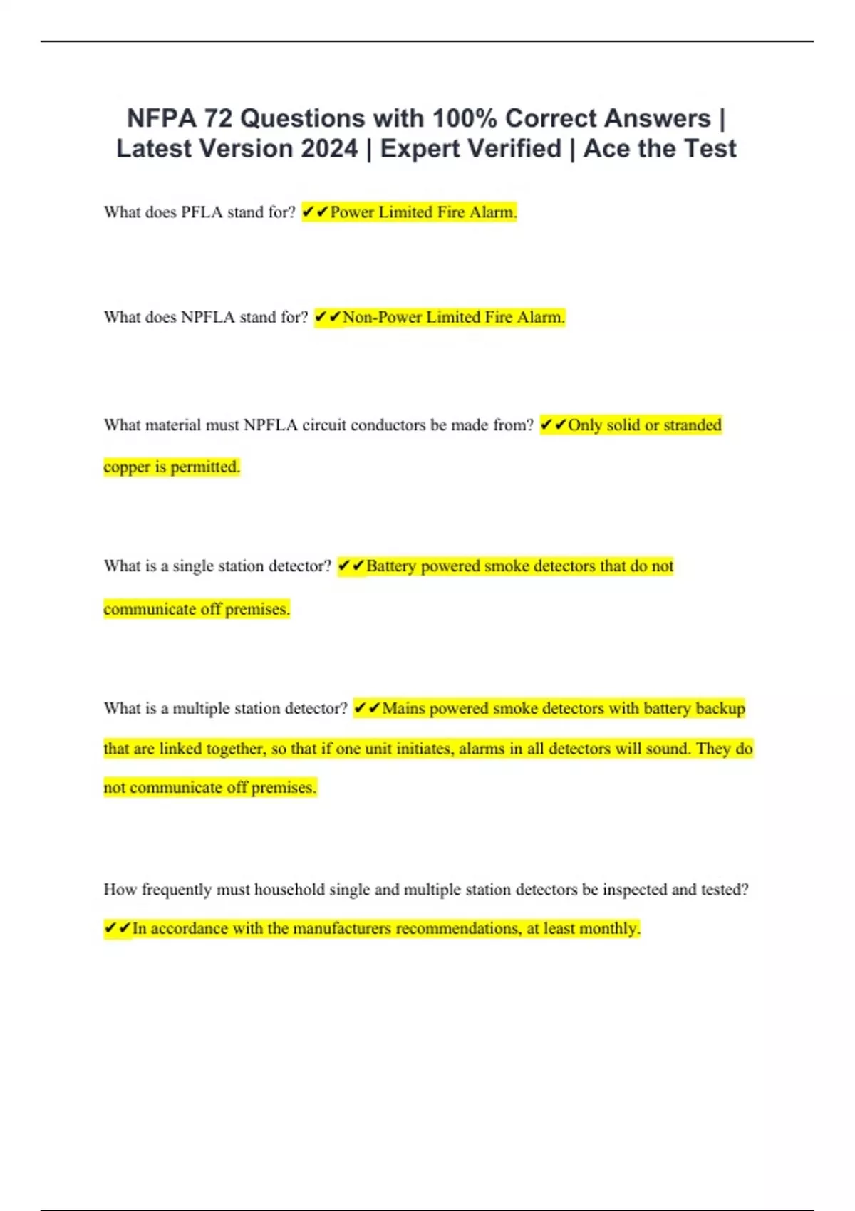 NFPA 72 Questions with 100% Correct Answers | Latest Version 2024 | Expert Verified | Ace the Test