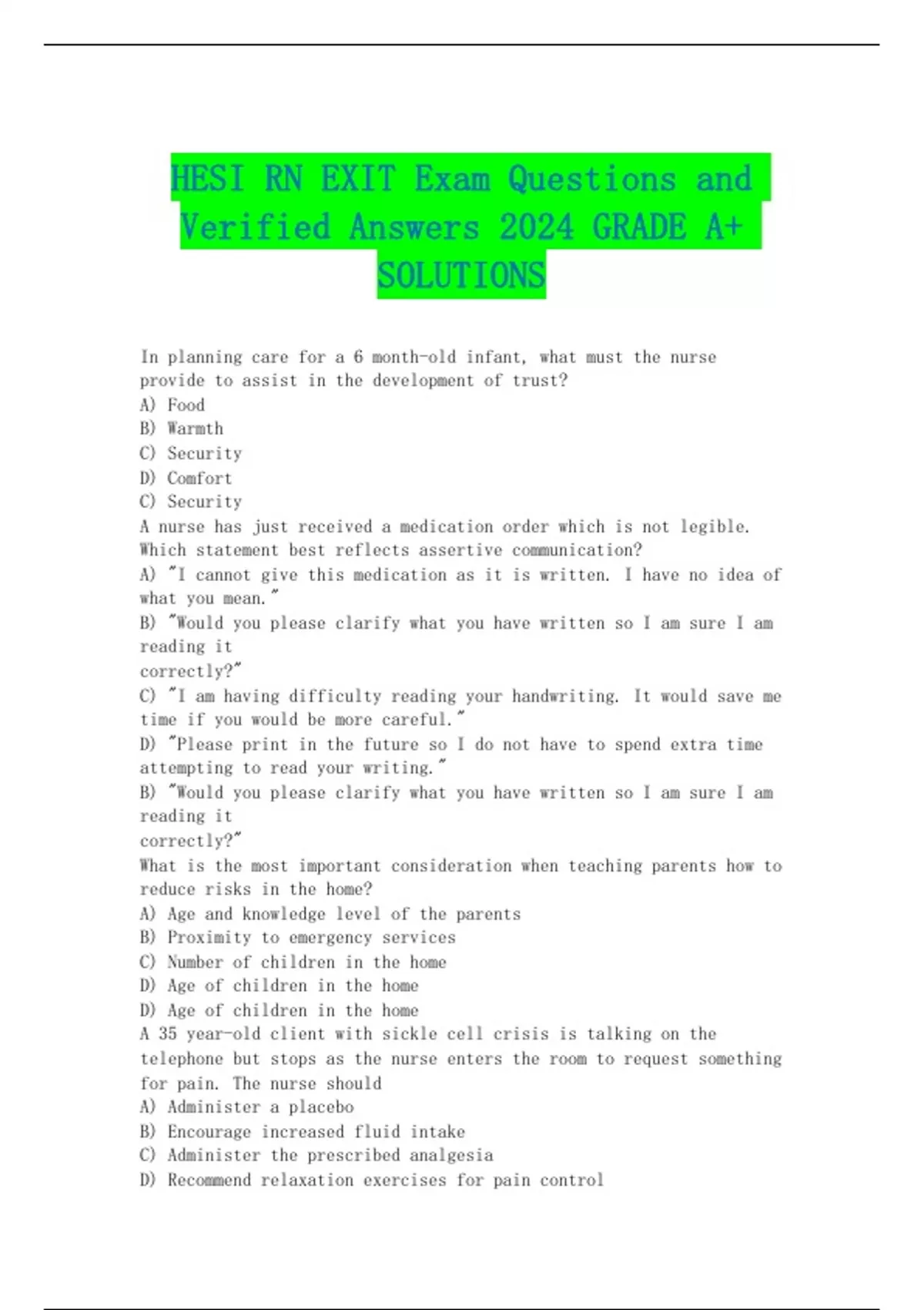 HESI RN EXIT Exam Questions and Verified Answers 2024 GRADE A+ SOLUTIONS
