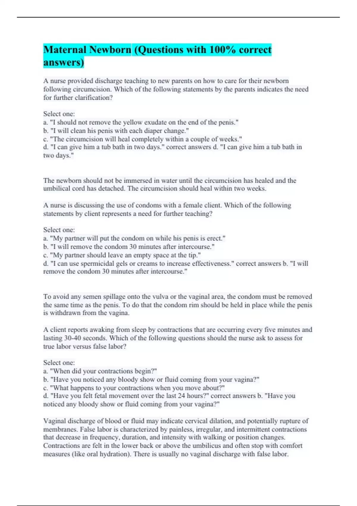A nurse provided discharge teaching to new parents on how to care for their newborn following circumcision. Which of the following statements by the parents indicates the need for further clarification? Select one: a. "I should not remove the yellow exudate on the end of the penis." b. "I will clean his penis with each diaper change." c. "The circumcision will heal completely within a couple of weeks." d. "I can give him a tub bath in two days." correct answers d. "I can give him a tub bath in two days." The newborn should not be immersed in water until the circumcision has healed and the umbilical cord has detached. The circumcision should heal within two weeks. A nurse is discussing the use of condoms with a female client. Which of the following statements by client represents a need for further teaching? Select one: a. "My partner will put the condom on while his penis is erect." b. "I will remove the condom 30 minutes after intercourse." c. "My partner should leave an empty space at the tip." d. "I can use spermicidal gels or creams to increase effectiveness." correct answers b. "I will remove the condom 30 minutes after intercourse." To avoid any semen spillage onto the vulva or the vaginal area, the condom must be removed the same time as the penis. To do that the condom rim should be held in place while the penis is withdrawn from the vagina. A client reports awaking from sleep by contractions that are occurring every five minutes and lasting 30-40 seconds. Which of the following questions should the nurse ask to assess for true labor versus false labor? Select one: a. "When did your contractions begin?" b. "Have you noticed any bloody show or fluid coming from your vagina?" c. "What happens to your contractions when you move about?" d. "Have you felt fetal movement over the last 24 hours?" correct answers b. "Have you noticed any bloody show or fluid coming from your vagina?" Vaginal discharge of blood or fluid may indicate cervical dilation, and potentially rupture of membranes. False labor is characterized by painless, irregular, and intermittent contractions that decrease in frequency, duration, and intensity with walking or position changes. Contractions are felt in the lower back or above the umbilicus and often stop with comfort measures (like oral hydration). There is usually no vaginal discharge with false labor.