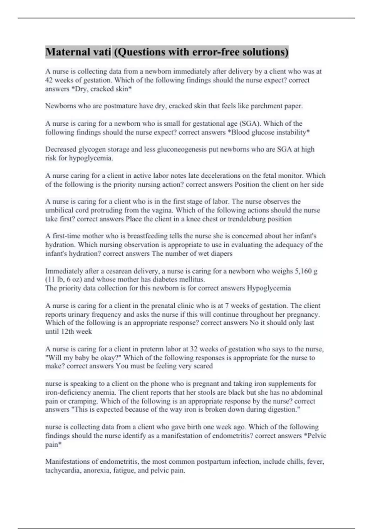 A nurse is collecting data from a newborn immediately after delivery by a client who was at 42 weeks of gestation. Which of the following findings should the nurse expect? correct answers *Dry, cracked skin* Newborns who are postmature have dry, cracked skin that feels like parchment paper. A nurse is caring for a newborn who is small for gestational age (SGA). Which of the following findings should the nurse expect? correct answers *Blood glucose instability* Decreased glycogen storage and less gluconeogenesis put newborns who are SGA at high risk for hypoglycemia. A nurse caring for a client in active labor notes late decelerations on the fetal monitor. Which of the following is the priority nursing action? correct answers Position the client on her side A nurse is caring for a client who is in the first stage of labor. The nurse observes the umbilical cord protruding from the vagina. Which of the following actions should the nurse take first? correct answers Place the client in a knee chest or trendeleburg position A first-time mother who is breastfeeding tells the nurse she is concerned about her infant's hydration. Which nursing observation is appropriate to use in evaluating the adequacy of the infant's hydration? correct answers The number of wet diapers Immediately after a cesarean delivery, a nurse is caring for a newborn who weighs 5,160 g (11 lb, 6 oz) and whose mother has diabetes mellitus. The priority data collection for this newborn is for correct answers Hypoglycemia A nurse is caring for a client in the prenatal clinic who is at 7 weeks of gestation. The client reports urinary frequency and asks the nurse if this will continue throughout her pregnancy. Which of the following is an appropriate response? correct answers No it should only last until 12th week A nurse is caring for a client in preterm labor at 32 weeks of gestation who says to the nurse, "Will my baby be okay?" Which of the following responses is appropriate for the nurse to make? correct answers You must be feeling very scared nurse is speaking to a client on the phone who is pregnant and taking iron supplements for iron-deficiency anemia. The client reports that her stools are black but she has no abdominal pain or cramping. Which of the following is an appropriate response by the nurse? correct answers "This is expected because of the way iron is broken down during digestion." nurse is collecting data from a client who gave birth one week ago. Which of the following findings should the nurse identify as a manifestation of endometritis? correct answers *Pelvic pain* Manifestations of endometritis, the most common postpartum infection, include chills, fever, tachycardia, anorexia, fatigue, and pelvic pain.