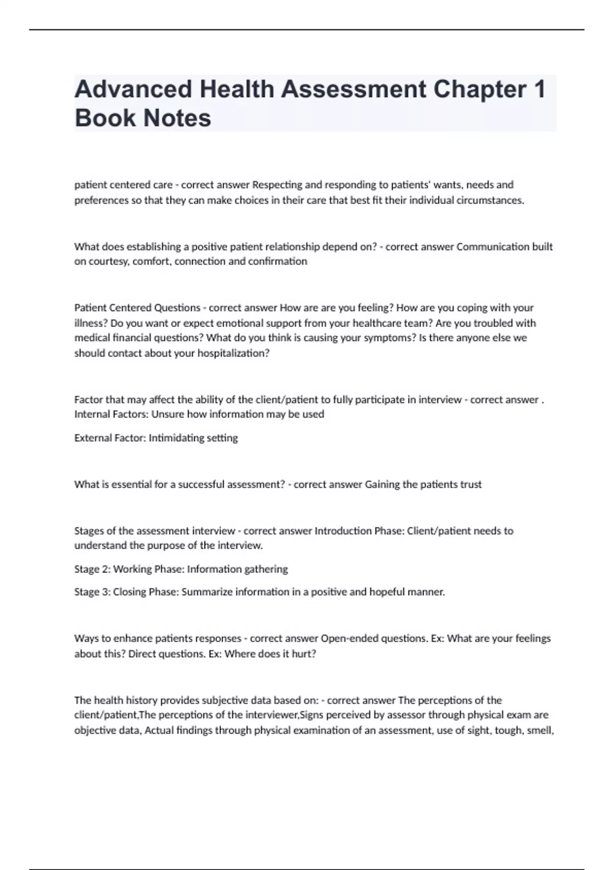 Advanced Health Assessment Chapter 1 Book Notes well answered passed!patient centered care - correct answer Respecting and responding to patients' wants, needs and preferences so that they can make choices in their care that best fit their individual circumstances. What does establishing a positive patient relationship depend on? - correct answer Communication built on courtesy, comfort, connection and confirmation Patient Centered Questions - correct answer How are are you feeling? How are you coping with your illness? Do you want or expect emotional support from your healthcare team? Are you troubled with medical financial questions? What do you think is causing your symptoms? Is there anyone else we should contact about your hospitalization? Factor that may affect the ability of the client/patient to fully participate in interview - correct answer . Internal Factors: Unsure how information may be used External Factor: Intimidating setting What is essential for a successful assessment? - correct answer Gaining the patients trust Stages of the assessment interview - correct answer Introduction Phase: Client/patient needs to understand the purpose of the interview. Stage 2: Working Phase: Information gathering Stage 3: Closing Phase: Summarize information in a positive and hopeful manner. Ways to enhance patients responses - correct answer Open-ended questions. Ex: What are your feelings about this? Direct questions. Ex: Where does it hurt? The health history provides subjective data based on: - correct answer The perceptions of the client/patient,The perceptions of the interviewer,Signs perceived by assessor through physical exam are objective data, Actual findings through physical examination of an assessment, use of sight, tough, smell,