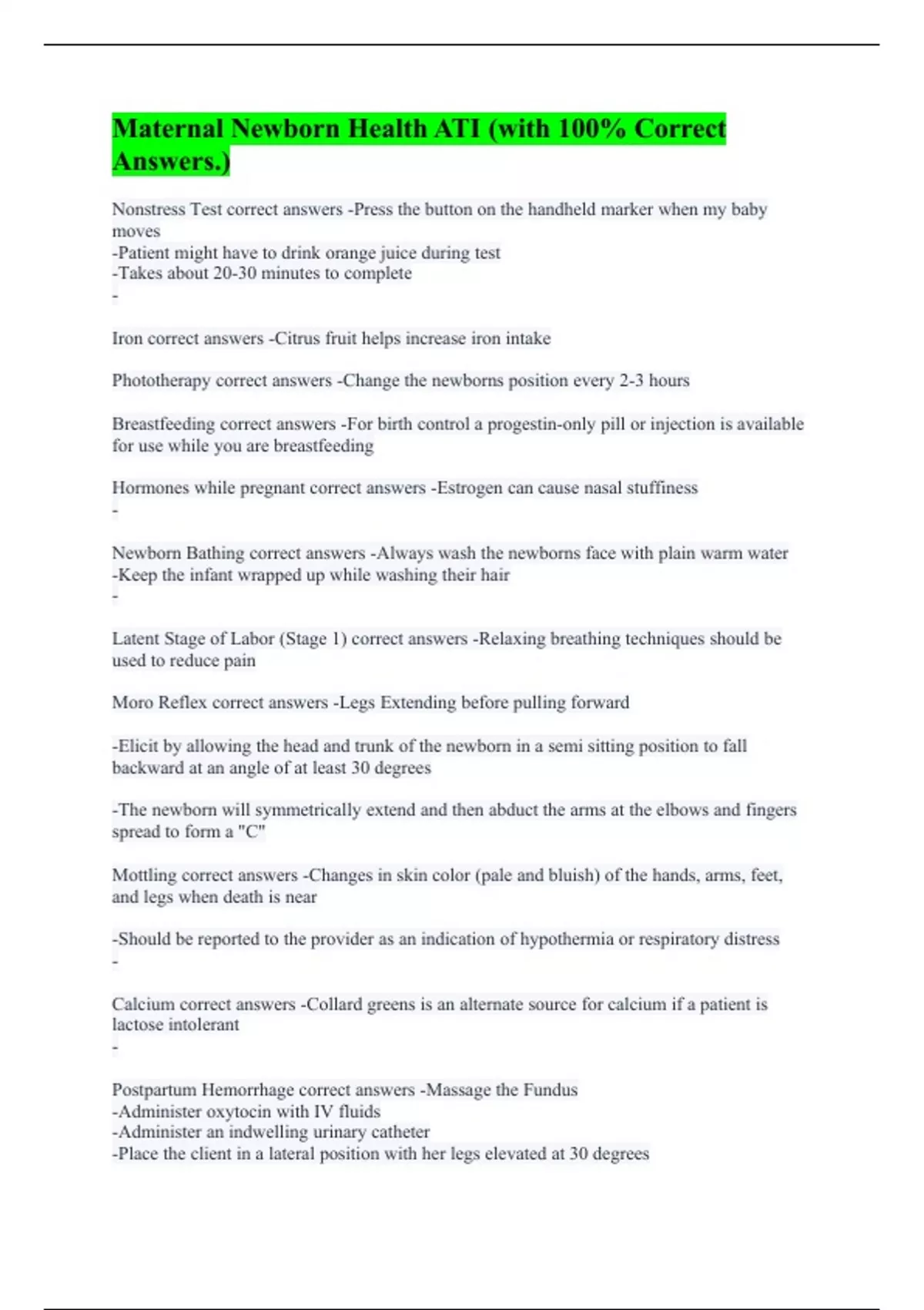 Nonstress Test correct answers -Press the button on the handheld marker when my baby moves -Patient might have to drink orange juice during test -Takes about 20-30 minutes to complete - Iron correct answers -Citrus fruit helps increase iron intake Phototherapy correct answers -Change the newborns position every 2-3 hours Breastfeeding correct answers -For birth control a progestin-only pill or injection is available for use while you are breastfeeding Hormones while pregnant correct answers -Estrogen can cause nasal stuffiness - Newborn Bathing correct answers -Always wash the newborns face with plain warm water -Keep the infant wrapped up while washing their hair - Latent Stage of Labor (Stage 1) correct answers -Relaxing breathing techniques should be used to reduce pain Moro Reflex correct answers -Legs Extending before pulling forward -Elicit by allowing the head and trunk of the newborn in a semi sitting position to fall backward at an angle of at least 30 degrees -The newborn will symmetrically extend and then abduct the arms at the elbows and fingers spread to form a "C" Mottling correct answers -Changes in skin color (pale and bluish) of the hands, arms, feet, and legs when death is near -Should be reported to the provider as an indication of hypothermia or respiratory distress - Calcium correct answers -Collard greens is an alternate source for calcium if a patient is lactose intolerant - Postpartum Hemorrhage correct answers -Massage the Fundus -Administer oxytocin with IV fluids -Administer an indwelling urinary catheter -Place the client in a lateral position with her legs elevated at 30 degrees