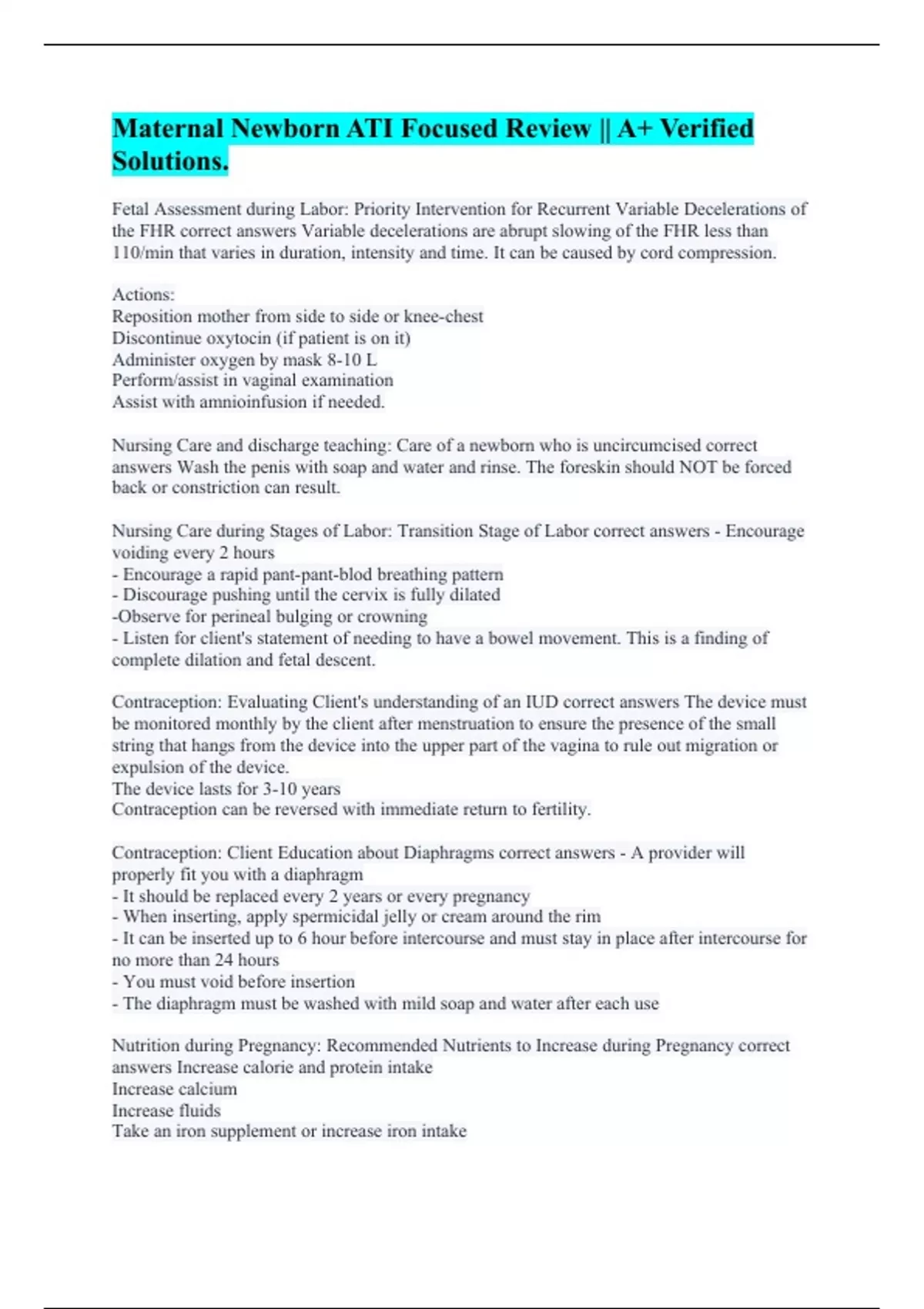 Fetal Assessment during Labor: Priority Intervention for Recurrent Variable Decelerations of the FHR correct answers Variable decelerations are abrupt slowing of the FHR less than 110/min that varies in duration, intensity and time. It can be caused by cord compression. Actions: Reposition mother from side to side or knee-chest Discontinue oxytocin (if patient is on it) Administer oxygen by mask 8-10 L Perform/assist in vaginal examination Assist with amnioinfusion if needed. Nursing Care and discharge teaching: Care of a newborn who is uncircumcised correct answers Wash the penis with soap and water and rinse. The foreskin should NOT be forced back or constriction can result. Nursing Care during Stages of Labor: Transition Stage of Labor correct answers - Encourage voiding every 2 hours - Encourage a rapid pant-pant-blod breathing pattern - Discourage pushing until the cervix is fully dilated -Observe for perineal bulging or crowning - Listen for client's statement of needing to have a bowel movement. This is a finding of complete dilation and fetal descent. Contraception: Evaluating Client's understanding of an IUD correct answers The device must be monitored monthly by the client after menstruation to ensure the presence of the small string that hangs from the device into the upper part of the vagina to rule out migration or expulsion of the device. The device lasts for 3-10 years Contraception can be reversed with immediate return to fertility. Contraception: Client Education about Diaphragms correct answers - A provider will properly fit you with a diaphragm - It should be replaced every 2 years or every pregnancy - When inserting, apply spermicidal jelly or cream around the rim - It can be inserted up to 6 hour before intercourse and must stay in place after intercourse for no more than 24 hours - You must void before insertion - The diaphragm must be washed with mild soap and water after each use Nutrition during Pregnancy: Recommended Nutrients to Increase during Pregnancy correct answers Increase calorie and protein intake Increase calcium Increase fluids Take an iron supplement or increase iron intake