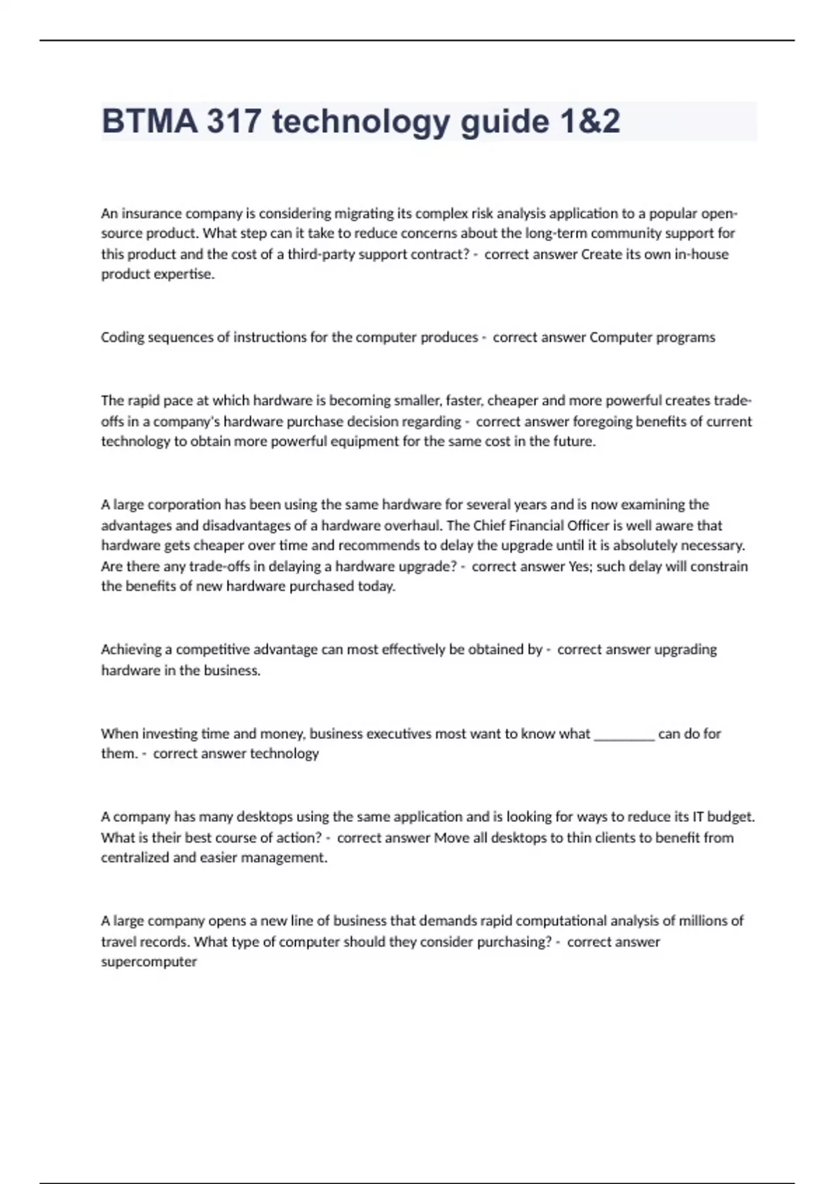 BTMA 317 technology guide 1&2 verified answersAn insurance company is considering migrating its complex risk analysis application to a popular open-source product. What step can it take to reduce concerns about the long-term community support for this product and the cost of a third-party support contract? - correct answer Create its own in-house product expertise. Coding sequences of instructions for the computer produces - correct answer Computer programs The rapid pace at which hardware is becoming smaller, faster, cheaper and more powerful creates trade-offs in a company's hardware purchase decision regarding - correct answer foregoing benefits of current technology to obtain more powerful equipment for the same cost in the future. A large corporation has been using the same hardware for several years and is now examining the advantages and disadvantages of a hardware overhaul. The Chief Financial Officer is well aware that hardware gets cheaper over time and recommends to delay the upgrade until it is absolutely necessary. Are there any trade-offs in delaying a hardware upgrade? - correct answer Yes; such delay will constrain the benefits of new hardware purchased today. Achieving a competitive advantage can most effectively be obtained by - correct answer upgrading hardware in the business. When investing time and money, business executives most want to know what ________ can do for them. - correct answer technology A company has many desktops using the same application and is looking for ways to reduce its IT budget. What is their best course of action? - correct answer Move all desktops to thin clients to benefit from centralized and easier management. A large company opens a new line of business that demands rapid computational analysis of millions of travel records. What type of computer should they consider purchasing? - correct answer supercomputer