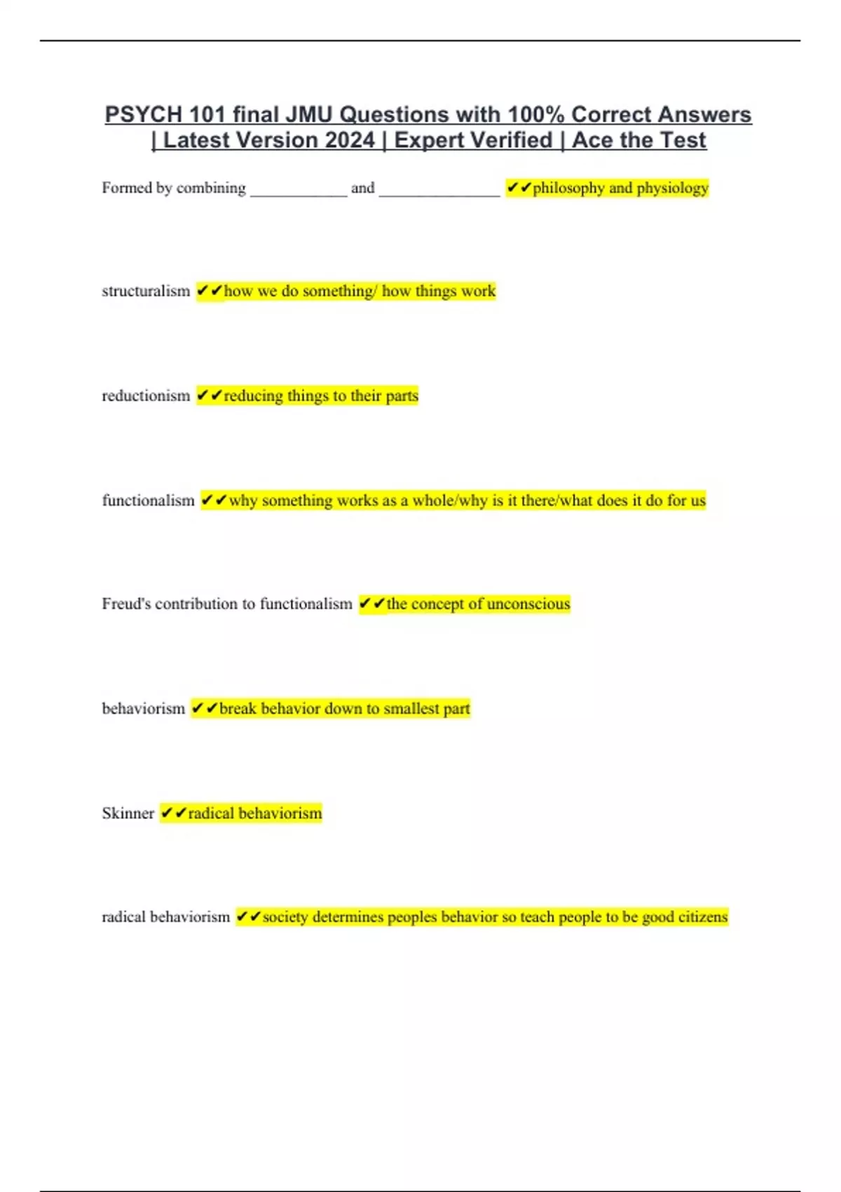 PSYCH 101 final JMU Questions with 100% Correct Answers | Latest Version 2024 | Expert Verified | Ace the Test