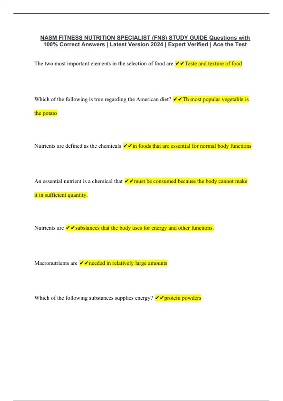 NASM FITNESS NUTRITION SPECIALIST (FNS) STUDY GUIDE Questions with 100% Correct Answers | Latest Version 2024 | Expert Verified | Ace the Test