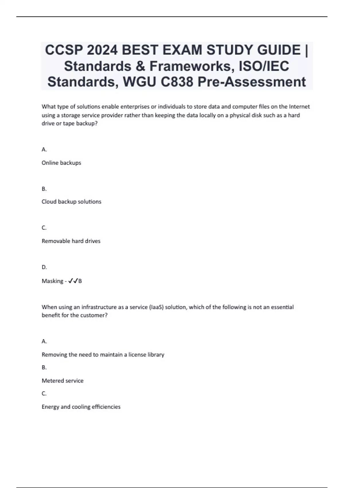 What type of solutions enable enterprises or individuals to store data and computer files on the Internet using a storage service provider rather than keeping the data locally on a physical disk such as a hard drive or tape backup? A. Online backups B. Cloud backup solutions C. Removable hard drives D. Masking - B When using an infrastructure as a service (IaaS) solution, which of the following is not an essential benefit for the customer? A. Removing the need to maintain a license library B. Metered service C. Energy and cooling efficiencies