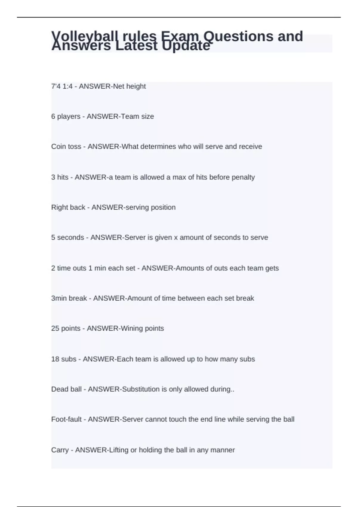 players - ANSWER-Team size Coin toss - ANSWER-What determines who will serve and receive 3 hits - ANSWER-a team is allowed a max of hits before penalty Right back - ANSWER-serving position 5 seconds - ANSWER-Server is given x amount of seconds to serve 2 time outs 1 min each set - ANSWER-Amounts of outs each team gets 3min break - ANSWER-Amount of time between each set break 25 points - ANSWER-Wining points 18 subs - ANSWER-Each team is allowed up to how many subs Dead ball - ANSWER-Substitution is only allowed during.. Foot-fault - ANSWER-Server cannot touch the end line while serving the ball Carry - ANSWER-Lifting or holding the ball in any manner Double hit - ANSWER-A hit in which the arms or hands do not contact the ball in a simultaneous manner